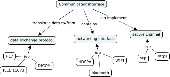 Questa Cmap, creata con IHMC CmapTools, contiene informazioni relative a: Artefacts-communicationInterface, HL7 is a data exchange protocol, https is a secure channel, HDSPA is a networking interface, DICOM is a data exchange protocol, WIFI is a networking interface, bluetooth is a networking interface, CommunicationInterface can implement secure channel, IEEE 11073 is a data exchange protocol, CommunicationInterface contains networking interface, CommunicationInterface translates data to/from data exchange protocol, scp is a secure channel