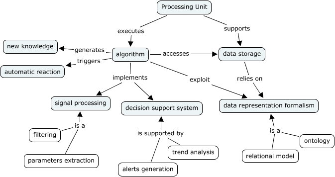 Questa Cmap, creata con IHMC CmapTools, contiene informazioni relative a: Artefacts-processingUnit, algorithm implements signal processing, trend analysis is supported by decision support system, ontology is a data representation formalism, Processing Unit supports data storage, filtering is a signal processing, algorithm implements decision support system, Processing Unit executes algorithm, data storage relies on data representation formalism, algorithm triggers automatic reaction, parameters extraction is a signal processing, alerts generation is supported by decision support system, relational model is a data representation formalism, algorithm exploit data representation formalism, algorithm generates new knowledge, algorithm accesses data storage