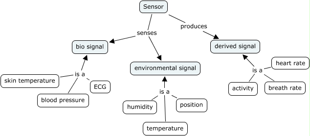Questa Cmap, creata con IHMC CmapTools, contiene informazioni relative a: Artefacts-sensor, ECG is a bio signal, temperature is a environmental signal, breath rate is a derived signal, Sensor senses environmental signal, skin temperature is a bio signal, position is a environmental signal, activity is a derived signal, heart rate is a derived signal, Sensor produces derived signal, blood pressure is a bio signal, humidity is a environmental signal, Sensor senses bio signal