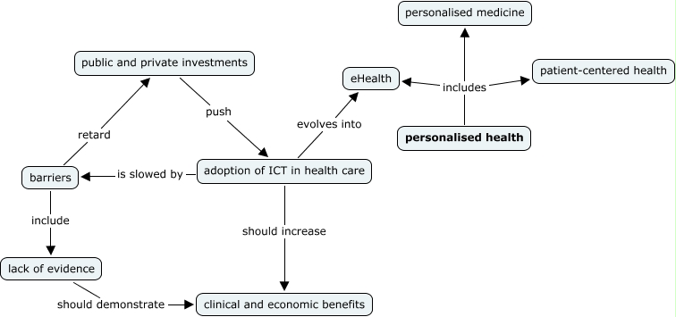Questa Cmap, creata con IHMC CmapTools, contiene informazioni relative a: ICT and healthcare, adoption of ICT in health care is slowed by barriers, barriers include lack of evidence, personalised health includes eHealth, personalised health includes personalised medicine, lack of evidence should demonstrate clinical and economic benefits, public and private investments push adoption of ICT in health care, barriers retard public and private investments, personalised health includes patient-centered health, adoption of ICT in health care should increase clinical and economic benefits, adoption of ICT in health care evolves into eHealth