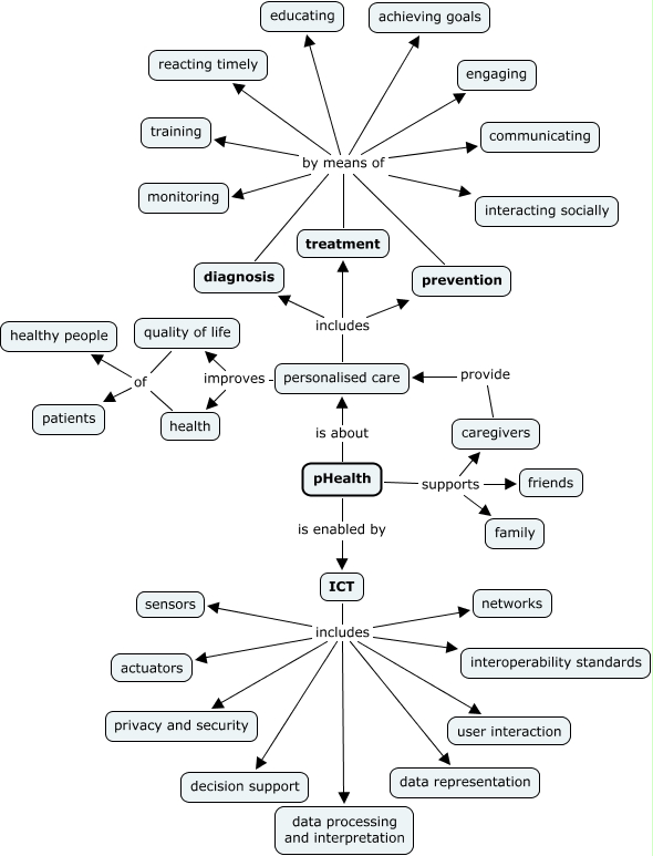 Questa Cmap, creata con IHMC CmapTools, contiene informazioni relative a: Base Model, personalised care includes prevention, pHealth is enabled by ICT, ICT includes privacy and security, diagnosis by means of communicating, diagnosis by means of interacting socially, prevention by means of engaging, health of healthy people, treatment by means of communicating, ICT includes sensors, ICT includes data representation, prevention by means of achieving goals, ICT includes decision support, health of patients, quality of life of healthy people, diagnosis by means of reacting timely, ICT includes user interaction, prevention by means of training, prevention by means of reacting timely, treatment by means of reacting timely, ICT includes actuators