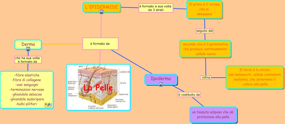 Questa Cmap, creata con IHMC CmapTools, contiene informazioni relative a: la pelle 2, secondo che è il germinativo che produce continuamente cellule nuove seguito dal Il primo è il corneo che si desquama, La Pelle è formato da L'EPIDERMIDE, La Pelle è formato da Derma, Derma che ha sua volta è formato da -fibre elastiche -fibre di collagene -vasi sanguigni -terminazioni nervose -ghiandole sebacee -ghiandole sudoripare -bulbi piliferi, L'EPIDERMIDE è formato a sua volta da 3 strati Il primo è il corneo che si desquama, La Pelle è formato da Ipoderma, secondo che è il germinativo che produce continuamente cellule nuove infine Il terzo è lo strato con melanociti, cellule contenenti melanina, che determina il colore alla pelle, Ipoderma è costituito da un tessuto adiposo che dà protezione alla pelle