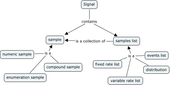 Questa Cmap, creata con IHMC CmapTools, contiene informazioni relative a: Data-Signal, Signal contains samples list, compound sample is a sample, enumeration sample is a sample, numeric sample is a sample, fixed rate list is a samples list, Signal contains sample, distribution is a samples list, events list is a samples list, variable rate list is a samples list, samples list is a collection of sample