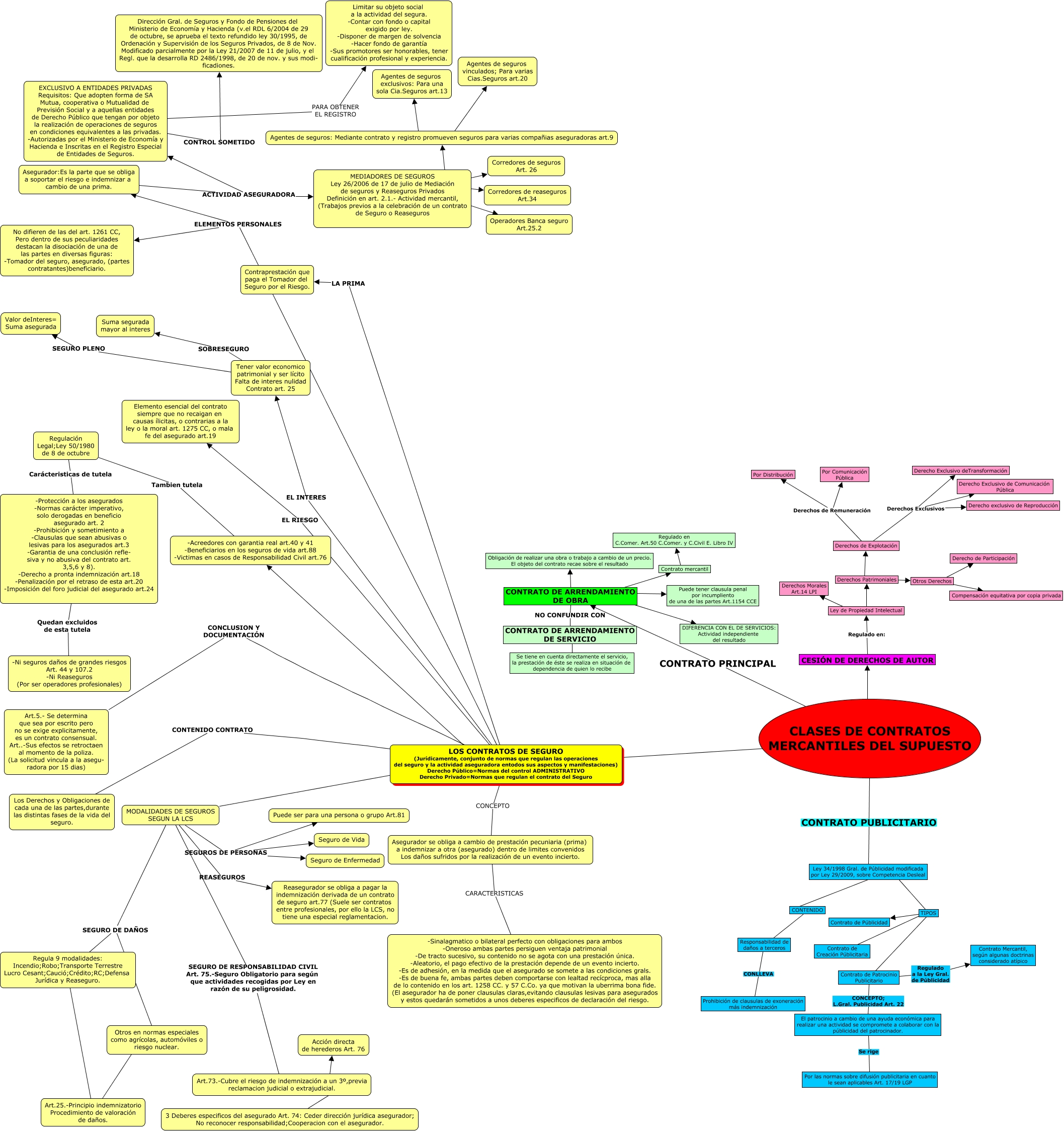 Este Cmap, tiene información relacionada con: contrato seguros, Derechos de Explotación Derechos Exclusivos Derecho Exclusivo deTransformación, MEDIADORES DE SEGUROS Ley 26/2006 de 17 de julio de Mediación de seguros y Reaseguros Privados Definición en art. 2.1.- Actividad mercantil, (Trabajos previos a la celebración de un contrato de Seguro o Reaseguros ???? Corredores de reaseguros Art.34, CONTENIDO ???? Responsabilidad de daños a terceros, MODALIDADES DE SEGUROS SEGUN LA LCS SEGUROS DE PERSONAS Puede ser para una persona o grupo Art.81, MODALIDADES DE SEGUROS SEGUN LA LCS SEGUROS DE PERSONAS Seguro de Enfermedad, Tener valor economico patrimonial y ser lícito Falta de interes nulidad Contrato art. 25 SEGURO PLENO Valor deInteres= Suma asegurada, Regulación Legal;Ley 50/1980 de 8 de octubre Tambien tutela -Acreedores con garantia real art.40 y 41 -Beneficiarios en los seguros de vida art.88 -Victimas en casos de Responsabilidad Civil art.76, MODALIDADES DE SEGUROS SEGUN LA LCS REASEGUROS Reasegurador se obliga a pagar la indemnización derivada de un contrato de seguro art.77 (Suele ser contratos entre profesionales, por ello la LCS, no tiene una especial reglamentacion., Otros Derechos ???? Derecho de Participación, MODALIDADES DE SEGUROS SEGUN LA LCS SEGURO DE DAÑOS Otros en normas especiales como agrícolas, automóviles o riesgo nuclear., CONTRATO DE ARRENDAMIENTO DE SERVICIO ???? Se tiene en cuenta directamente el servicio, la prestación de éste se realiza en situación de dependencia de quien lo recibe, Regulación Legal;Ley 50/1980 de 8 de octubre Carácteristicas de tutela -Protección a los asegurados -Normas carácter imperativo, solo derogadas en beneficio asegurado art. 2 -Prohibición y sometimiento a -Clausulas que sean abusivas o lesivas para los asegurados art.3 -Garantia de una conclusión refle- siva y no abusiva del contrato art. 3,5,6 y 8). -Derecho a pronta indemnización art.18 -Penalización por el retraso de esta art.20 -Imposición del foro judicial del asegurado art.24, EXCLUSIVO A ENTIDADES PRIVADAS Requisitos: Que adopten forma de SA Mutua, cooperativa o Mutualidad de Previsión Social y a aquellas entidades de Derecho Público que tengan por objeto la realización de operaciones de seguros en condiciones equivalentes a las privadas. -Autorizadas por el Ministerio de Economía y Hacienda e Inscritas en el Registro Especial de Entidades de Seguros. CONTROL SOMETIDO Dirección Gral. de Seguros y Fondo de Pensiones del Ministerio de Economía y Hacienda (v.el RDL 6/2004 de 29 de octubre, se aprueba el texto refundido ley 30/1995, de Ordenación y Supervisión de los Seguros Privados, de 8 de Nov. Modificado parcialmente por la Ley 21/2007 de 11 de julio, y el Regl. que la desarrolla RD 2486/1998, de 20 de nov. y sus modi- ficadiones., LOS CONTRATOS DE SEGURO (Jurídicamente, conjunto de normas que regulan las operaciones del seguro y la actividad aseguradora entodos sus aspectos y manifestaciones) Derecho Público=Normas del control ADMINISTRATIVO Derecho Privado=Normas que regulan el contrato del Seguro EL RIESGO Elemento esencial del contrato siempre que no recaigan en causas ílicitas, o contrarias a la ley o la moral art. 1275 CC, o mala fe del asegurado art.19, Asegurador:Es la parte que se obliga a soportar el riesgo e indemnizar a cambio de una prima. ACTIVIDAD ASEGURADORA EXCLUSIVO A ENTIDADES PRIVADAS Requisitos: Que adopten forma de SA Mutua, cooperativa o Mutualidad de Previsión Social y a aquellas entidades de Derecho Público que tengan por objeto la realización de operaciones de seguros en condiciones equivalentes a las privadas. -Autorizadas por el Ministerio de Economía y Hacienda e Inscritas en el Registro Especial de Entidades de Seguros., CONTRATO DE ARRENDAMIENTO DE OBRA ???? Puede tener clausula penal por incumpliento de una de las partes Art.1154 CCE, Asegurador:Es la parte que se obliga a soportar el riesgo e indemnizar a cambio de una prima. ACTIVIDAD ASEGURADORA MEDIADORES DE SEGUROS Ley 26/2006 de 17 de julio de Mediación de seguros y Reaseguros Privados Definición en art. 2.1.- Actividad mercantil, (Trabajos previos a la celebración de un contrato de Seguro o Reaseguros, El patrocinio a cambio de una ayuda económica para realizar una actividad se compromete a colaborar con la públicidad del patrocinador. Se rige Por las normas sobre difusión publicitaria en cuanto le sean aplicables Art. 17/19 LGP, CESIÓN DE DERECHOS DE AUTOR Regulado en: Ley de Propiedad Intelectual, Ley de Propiedad Intelectual ???? Derechos Patrimoniales