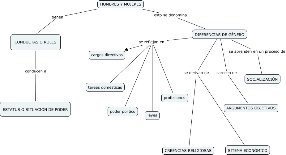 Este Cmap, tiene información relacionada con: diferencias de género, DIFERENCIAS DE GÉNERO se aprenden en un proceso de SOCIALIZACIÓN, HOMBRES Y MUJERES tienen CONDUCTAS O ROLES, DIFERENCIAS DE GÉNERO se reflejan en tareas domésticas, DIFERENCIAS DE GÉNERO se reflejan en cargos directivos, CONDUCTAS O ROLES conducen a ESTATUS O SITUACIÓN DE PODER, HOMBRES Y MUJERES esto se denomina DIFERENCIAS DE GÉNERO, DIFERENCIAS DE GÉNERO carecen de ARGUMENTOS OBJETIVOS, DIFERENCIAS DE GÉNERO se reflejan en profesiones, DIFERENCIAS DE GÉNERO se reflejan en leyes, DIFERENCIAS DE GÉNERO se derivan de SITEMA ECONÓMICO, DIFERENCIAS DE GÉNERO se derivan de CREENCIAS RELIGIOSAS, DIFERENCIAS DE GÉNERO se reflejan en poder político