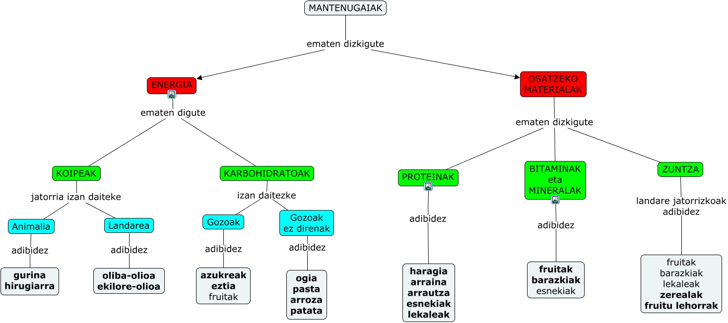 Este Cmap, tiene información relacionada con: Gure elikadura (1) Mantenugaiak, OSATZEKO MATERIALAK ematen dizkigute PROTEINAK, KOIPEAK jatorria izan daiteke Animalia, KOIPEAK jatorria izan daiteke Landarea, Gozoak ez direnak adibidez ogia pasta arroza patata, Animalia adibidez gurina hirugiarra, ZUNTZA landare jatorrizkoak adibidez fruitak barazkiak lekaleak zerealak fruitu lehorrak, OSATZEKO MATERIALAK ematen dizkigute ZUNTZA, PROTEINAK adibidez haragia arraina arrautza esnekiak lekaleak, MANTENUGAIAK ematen dizkigute ENERGIA, MANTENUGAIAK ematen dizkigute OSATZEKO MATERIALAK, ENERGIA ematen digute KARBOHIDRATOAK, Landarea adibidez oliba-olioa ekilore-olioa, BITAMINAK eta MINERALAK adibidez fruitak barazkiak esnekiak, KARBOHIDRATOAK izan daitezke Gozoak ez direnak, KARBOHIDRATOAK izan daitezke Gozoak, ENERGIA ematen digute KOIPEAK, OSATZEKO MATERIALAK ematen dizkigute BITAMINAK eta MINERALAK, Gozoak adibidez azukreak eztia fruitak