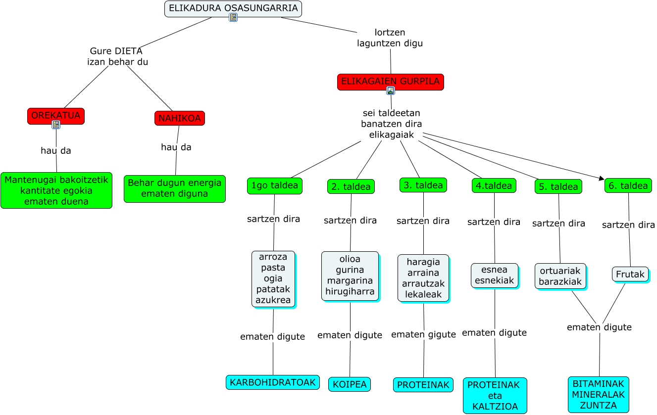 Este Cmap, tiene información relacionada con: Gure elikadura (2) Elikadura osasungarria, ELIKADURA OSASUNGARRIA Gure DIETA izan behar du OREKATUA, ELIKAGAIEN GURPILA sei taldeetan banatzen dira elikagaiak 3. taldea, ELIKAGAIEN GURPILA sei taldeetan banatzen dira elikagaiak 1go taldea, esnea esnekiak ematen digute PROTEINAK eta KALTZIOA, ELIKAGAIEN GURPILA sei taldeetan banatzen dira elikagaiak 4.taldea, arroza pasta ogia patatak azukrea ematen digute KARBOHIDRATOAK, 4.taldea sartzen dira esnea esnekiak, 6. taldea sartzen dira Frutak, Frutak ematen digute BITAMINAK MINERALAK ZUNTZA, ELIKADURA OSASUNGARRIA Gure DIETA izan behar du NAHIKOA, ELIKAGAIEN GURPILA sei taldeetan banatzen dira elikagaiak 6. taldea, haragia arraina arrautzak lekaleak ematen gigute PROTEINAK, ortuariak barazkiak ematen digute BITAMINAK MINERALAK ZUNTZA, OREKATUA hau da Mantenugai bakoitzetik kantitate egokia ematen duena, ELIKADURA OSASUNGARRIA lortzen laguntzen digu ELIKAGAIEN GURPILA, NAHIKOA hau da Behar dugun energia ematen diguna, 2. taldea sartzen dira olioa gurina margarina hirugiharra, 1go taldea sartzen dira arroza pasta ogia patatak azukrea, 3. taldea sartzen dira haragia arraina arrautzak lekaleak, olioa gurina margarina hirugiharra ematen digute KOIPEA