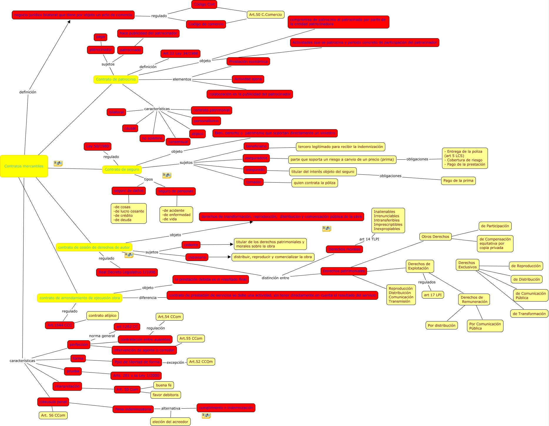 Este Cmap, tiene información relacionada con: Escenari 1, Contratos mercantiles ???? Contrato de seguro, Contrato de patrocinio elementos colaboración en la publicidad del patrocinador, cedente ???? titular de los derechos patrimoniales y morales sobre la obra, parte que soporta un riesgo a canvio de un precio (prima) obligaciones - Entrega de la poliza (art 5 LCS) - Cobertura de riesgo - Pago de la prestación, clásusula penal ???? Pena indemnizatoria, clásusula penal ???? Art. 56 CCom, Contrato de seguro objeto Bien, derecho o patrimonio que soportan directamente un siniestro, Derechos Exclusivos ???? de Reproducción, Contrato de patrocinio características causal, contrato de cesión de derechos de autor regulado Real Decreto Legislativo 1/1996, Art. 50 Com ???? buena fe, Derechos Exclusivos ???? de Comunicación Pública, contrato de cesión de derechos de autor sujetos cedente, cesionario ???? distribuir, reproducir y comercializar la obra, Contrato de patrocinio características consensual, Contrato de seguro sujetos asegurado, Ppio de libertad de forma excepción Art.52 CCOm, Contratos mercantiles ???? contrato de cesión de derechos de autor, Contratos mercantiles características clásusula penal, Contratos mercantiles características prueba