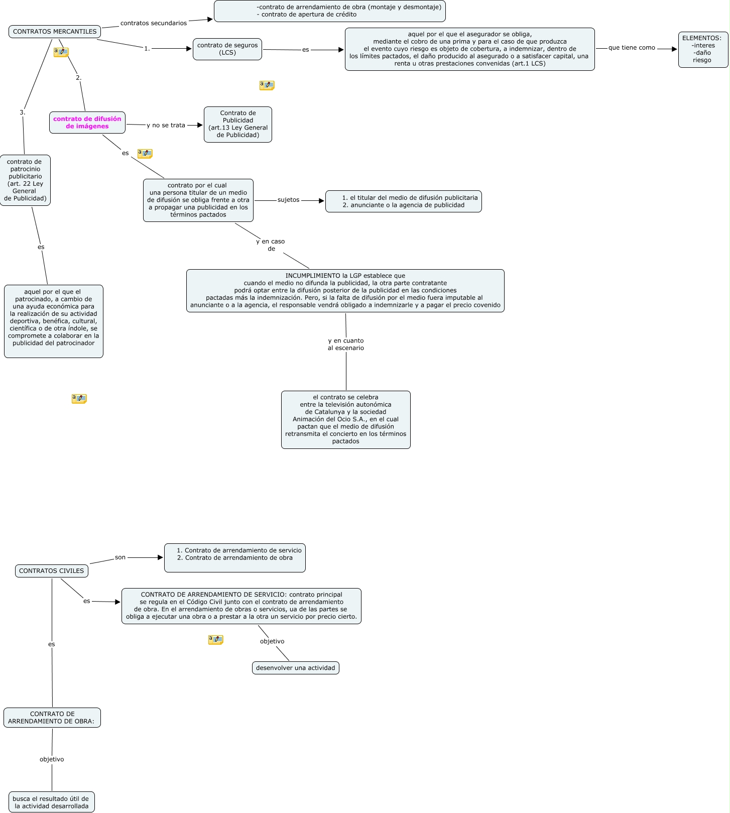 Este Cmap, tiene información relacionada con: cmap 1, contrato de patrocinio publicitario (art. 22 Ley General de Publicidad) es aquel por el que el patrocinado, a cambio de una ayuda económica para la realización de su actividad deportiva, benéfica, cultural, científica o de otra índole, se compromete a colaborar en la publicidad del patrocinador, contrato de seguros (LCS) es aquel por el que el asegurador se obliga, mediante el cobro de una prima y para el caso de que produzca el evento cuyo riesgo es objeto de cobertura, a indemnizar, dentro de los límites pactados, el daño producido al asegurado o a satisfacer capital, una renta u otras prestaciones convenidas (art.1 LCS), CONTRATOS CIVILES es CONTRATO DE ARRENDAMIENTO DE OBRA:, CONTRATOS MERCANTILES 2. contrato de difusión de imágenes, CONTRATOS CIVILES son 1. Contrato de arrendamiento de servicio 2. Contrato de arrendamiento de obra, INCUMPLIMIENTO la LGP establece que cuando el medio no difunda la publicidad, la otra parte contratante podrá optar entre la difusión posterior de la publicidad en las condiciones pactadas más la indemnización. Pero, si la falta de difusión por el medio fuera imputable al anunciante o a la agencia, el responsable vendrá obligado a indemnizarle y a pagar el precio covenido y en cuanto al escenario el contrato se celebra entre la televisión autonómica de Catalunya y la sociedad Animación del Ocio S.A., en el cual pactan que el medio de difusión retransmita el concierto en los términos pactados, aquel por el que el asegurador se obliga, mediante el cobro de una prima y para el caso de que produzca el evento cuyo riesgo es objeto de cobertura, a indemnizar, dentro de los límites pactados, el daño producido al asegurado o a satisfacer capital, una renta u otras prestaciones convenidas (art.1 LCS) que tiene como ELEMENTOS: -interes -daño riesgo, CONTRATOS MERCANTILES contratos secundarios -contrato de arrendamiento de obra (montaje y desmontaje) - contrato de apertura de crédito, contrato por el cual una persona titular de un medio de difusión se obliga frente a otra a propagar una publicidad en los términos pactados y en caso de INCUMPLIMIENTO la LGP establece que cuando el medio no difunda la publicidad, la otra parte contratante podrá optar entre la difusión posterior de la publicidad en las condiciones pactadas más la indemnización. Pero, si la falta de difusión por el medio fuera imputable al anunciante o a la agencia, el responsable vendrá obligado a indemnizarle y a pagar el precio covenido, CONTRATO DE ARRENDAMIENTO DE OBRA: objetivo busca el resultado útil de la actividad desarrollada, contrato por el cual una persona titular de un medio de difusión se obliga frente a otra a propagar una publicidad en los términos pactados sujetos 1. el titular del medio de difusión publicitaria 2. anunciante o la agencia de publicidad, CONTRATO DE ARRENDAMIENTO DE SERVICIO: contrato principal se regula en el Código Civil junto con el contrato de arrendamiento de obra. En el arrendamiento de obras o servicios, ua de las partes se obliga a ejecutar una obra o a prestar a la otra un servicio por precio cierto. objetivo desenvolver una actividad, CONTRATOS MERCANTILES 3. contrato de patrocinio publicitario (art. 22 Ley General de Publicidad), CONTRATOS CIVILES es CONTRATO DE ARRENDAMIENTO DE SERVICIO: contrato principal se regula en el Código Civil junto con el contrato de arrendamiento de obra. En el arrendamiento de obras o servicios, ua de las partes se obliga a ejecutar una obra o a prestar a la otra un servicio por precio cierto., contrato de difusión de imágenes es contrato por el cual una persona titular de un medio de difusión se obliga frente a otra a propagar una publicidad en los términos pactados, contrato de difusión de imágenes y no se trata Contrato de Publicidad (art.13 Ley General de Publicidad), CONTRATOS MERCANTILES 1. contrato de seguros (LCS)