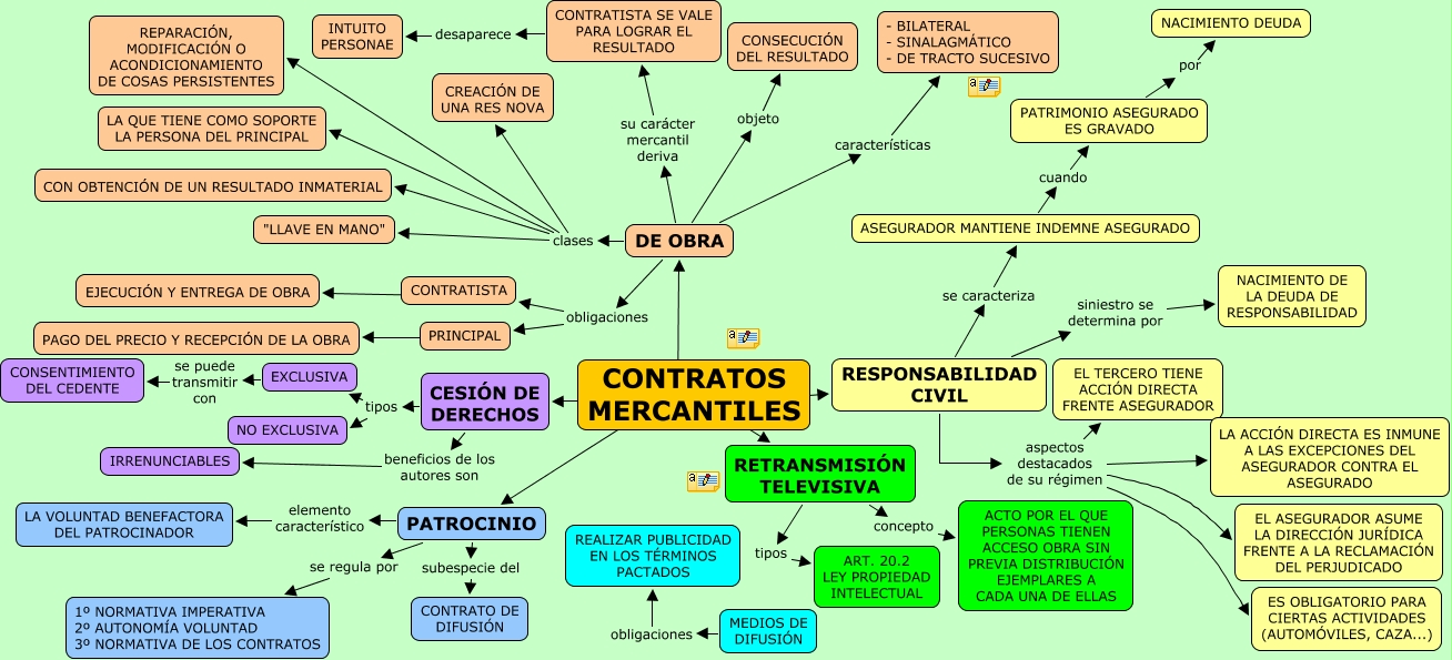 Este Cmap, tiene información relacionada con: ESCENARIO 1, RESPONSABILIDAD CIVIL aspectos destacados de su régimen LA ACCIÓN DIRECTA ES INMUNE A LAS EXCEPCIONES DEL ASEGURADOR CONTRA EL ASEGURADO, CONTRATOS MERCANTILES ???? RETRANSMISIÓN TELEVISIVA, RESPONSABILIDAD CIVIL se caracteriza ASEGURADOR MANTIENE INDEMNE ASEGURADO, PATROCINIO se regula por 1º NORMATIVA IMPERATIVA 2º AUTONOMÍA VOLUNTAD 3º NORMATIVA DE LOS CONTRATOS, CONTRATISTA ???? EJECUCIÓN Y ENTREGA DE OBRA, EXCLUSIVA se puede transmitir con CONSENTIMIENTO DEL CEDENTE, RESPONSABILIDAD CIVIL aspectos destacados de su régimen EL TERCERO TIENE ACCIÓN DIRECTA FRENTE ASEGURADOR, CESIÓN DE DERECHOS tipos EXCLUSIVA, DE OBRA características - BILATERAL - SINALAGMÁTICO - DE TRACTO SUCESIVO, ASEGURADOR MANTIENE INDEMNE ASEGURADO cuando PATRIMONIO ASEGURADO ES GRAVADO, PRINCIPAL ???? PAGO DEL PRECIO Y RECEPCIÓN DE LA OBRA, PATROCINIO subespecie del CONTRATO DE DIFUSIÓN, CESIÓN DE DERECHOS beneficios de los autores son IRRENUNCIABLES, RETRANSMISIÓN TELEVISIVA tipos ART. 20.2 LEY PROPIEDAD INTELECTUAL, MEDIOS DE DIFUSIÓN obligaciones REALIZAR PUBLICIDAD EN LOS TÉRMINOS PACTADOS, DE OBRA clases "LLAVE EN MANO", RESPONSABILIDAD CIVIL siniestro se determina por NACIMIENTO DE LA DEUDA DE RESPONSABILIDAD, DE OBRA clases CON OBTENCIÓN DE UN RESULTADO INMATERIAL, CONTRATOS MERCANTILES ???? RESPONSABILIDAD CIVIL, CONTRATOS MERCANTILES ???? DE OBRA