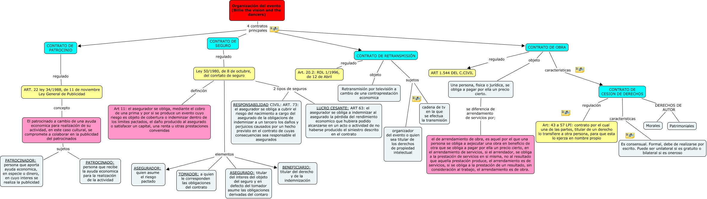 Aquest mapa conceptual conté informació relacionada amb: ESCENARIO 1, Organización del evento (Billie the vision and the dancers) 4 contratos princpales CONTRATO DE SEGURO, Ley 50/1980, de 8 de octubre, del conrtato de seguro 2 tipos de seguros LUCRO CESANTE: ART 63: el asegurador se obliga a indemnizar al asegurado la pérdida del rendimiento economico que hubiera podido alcanzarse en un acto o actividad de no haberse producido el siniestro descrito en el contrato, Ley 50/1980, de 8 de octubre, del conrtato de seguro 2 tipos de seguros RESPONSABILIDAD CIVIL: ART. 73: el asegurador se obliga a cubrir el riesgo del nacimiento a cargo del asegurado de la obligacions de indemnizar a un tercero los daños y perjuicios causados por un hecho previsto en el contrato de cuyas consecuencias sea responsable el asegurados, CONTRATO DE PATROCINIO regulado ART. 22 ley 34/1988, de 11 de noviembre Ley General de Publicidad, CONTRATO DE OBRA regulado ART 1.544 DEL C.CIVIL, Ley 50/1980, de 8 de octubre, del conrtato de seguro definción Art 11: el asegurador se obliga, mediante el cobro de una prima y por si se produce un evento cuyo riesgo es objeto de cobertura o indeminzar dentro de los limites pactados, el daño producido al asegurado o satisfacer un capital, una renta u otras prestaciones convenidas, Organización del evento (Billie the vision and the dancers) 4 contratos princpales CONTRATO DE RETRANSMISIÓN, CONTRATO DE CESION DE DERECHOS caracteristicas Es consensual. Formal, debe de realizarse por escrito. Puede ser unilateral si es gratuito o bilateral si es oneroso, Ley 50/1980, de 8 de octubre, del conrtato de seguro elementos ASEGURADOR: quien asume el riesgo pactado, CONTRATO DE RETRANSMISIÓN sujetos cadena de tv en la que se efectua la transmisión, El patrocinado a cambio de una ayuda economica para realización de su actividad, en este caso cultural, se compromete a colaborar en la publicidad del patrocinados sujetos PATROCINADO: persona que recibe la ayuda economica para la realización de la actividad, Ley 50/1980, de 8 de octubre, del conrtato de seguro elementos ASEGURADO: titular del interes del objeto del seguro y en defecto del tomador asume las obligaciones derivadas del contaro, Organización del evento (Billie the vision and the dancers) 4 contratos princpales CONTRATO DE PATROCINIO, CONTRATO DE CESION DE DERECHOS DERECHOS DE AUTOR Morales, CONTRATO DE CESION DE DERECHOS regulación Art: 43 a 57 LPI: contrato por el cual una de las partes, titular de un derecho lo transfiere a otra persona, para que esta lo ejerza en nombre propio, CONTRATO DE RETRANSMISIÓN regulado Art. 20.2: RDL 1/1996, de 12 de Abril, ART. 22 ley 34/1988, de 11 de noviembre Ley General de Publicidad concepto El patrocinado a cambio de una ayuda economica para realización de su actividad, en este caso cultural, se compromete a colaborar en la publicidad del patrocinados, CONTRATO DE OBRA objeto Una persona, fisica o jurídica, se obliga a pagar por ella un precio cierto., CONTRATO DE CESION DE DERECHOS DERECHOS DE AUTOR Patrimoniales, CONTRATO DE RETRANSMISIÓN objeto Retransmisión por televisión a cambio de una contraprestación economica