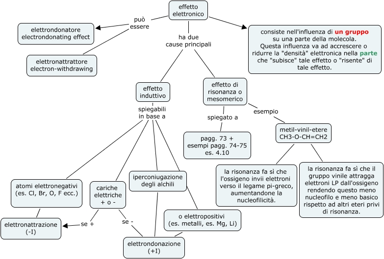 Questa Cmap, creata con IHMC CmapTools, contiene informazioni relative a: effetti-elettronici, cariche elettriche + o - se - elettrondonazione (+I), atomi elettronegativi (es. Cl, Br, O, F ecc.) elettronattrazione (-I), cariche elettriche + o - se + elettronattrazione (-I), effetto induttivo spiegabili in base a iperconiugazione degli alchili, effetto elettronico può essere elettrondonatore electrondonating effect, effetto induttivo spiegabili in base a cariche elettriche + o -, effetto induttivo spiegabili in base a o elettropositivi (es. metalli, es. Mg, Li), effetto elettronico ha due cause principali effetto di risonanza o mesomerico, o elettropositivi (es. metalli, es. Mg, Li) elettrondonazione (+I), iperconiugazione degli alchili elettrondonazione (+I), effetto elettronico ha due cause principali effetto induttivo, metil-vinil-etere CH3-O-CH=CH2 la risonanza fa sì che l'ossigeno invii elettroni verso il legame pi-greco, aumentandone la nucleofilicità., effetto elettronico può essere elettronattrattore electron-withdrawing, metil-vinil-etere CH3-O-CH=CH2 la risonanza fa sì che il gruppo vinile attragga elettroni LP dall'ossigeno rendendo questo meno nucleofilo e meno basico rispetto ad altri eteri privi di risonanza., effetto induttivo spiegabili in base a atomi elettronegativi (es. Cl, Br, O, F ecc.), effetto elettronico consiste nell'influenza di un gruppo su una parte della molecola. Questa influenza va ad accrescere o ridurre la "densità" elettronica nella parte che "subisce" tale effetto o "risente" di tale effetto., effetto di risonanza o mesomerico esempio metil-vinil-etere CH3-O-CH=CH2, effetto di risonanza o mesomerico spiegato a pagg. 73 + esempi pagg. 74-75 es. 4.10