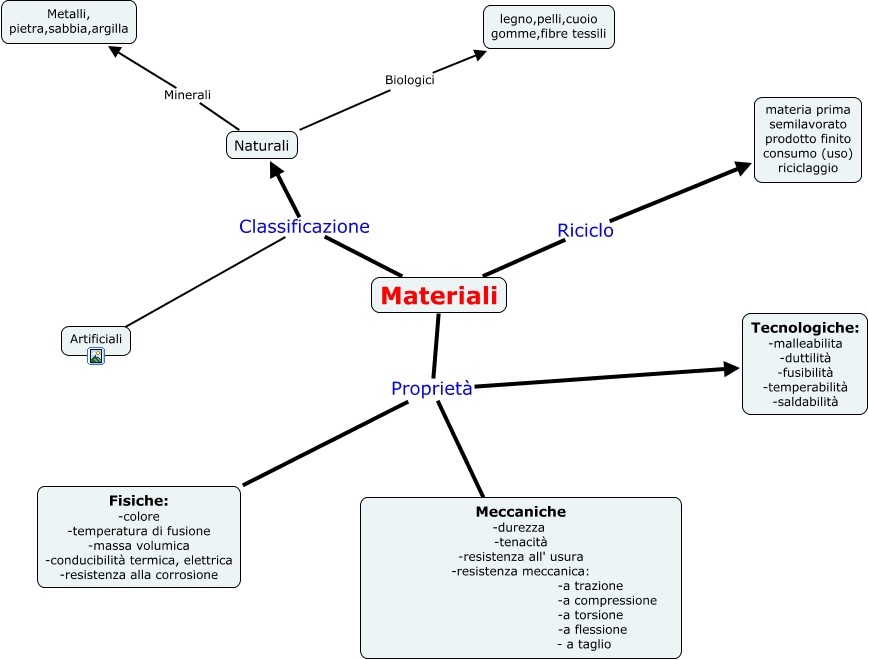 Questa Cmap, creata con IHMC CmapTools, contiene informazioni relative a: materiali, Materiali Proprietà Tecnologiche: -malleabilita -duttilità -fusibilità -temperabilità -saldabilità, Materiali Classificazione Naturali, Naturali Minerali Metalli, pietra,sabbia,argilla, Naturali Biologici legno,pelli,cuoio gomme,fibre tessili, Materiali Proprietà Fisiche: -colore -temperatura di fusione -massa volumica -conducibilità termica, elettrica -resistenza alla corrosione, Materiali Proprietà Meccaniche -durezza -tenacità -resistenza all' usura -resistenza meccanica: -a trazione -a compressione -a torsione -a flessione - a taglio, Materiali Riciclo materia prima semilavorato prodotto finito consumo (uso) riciclaggio, Materiali Classificazione ????