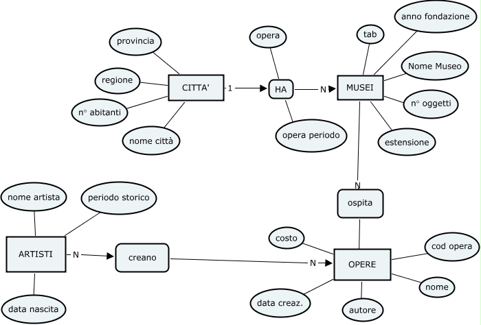 Questa Cmap, creata con IHMC CmapTools, contiene informazioni relative a: Musei Papo, creano N OPERE, OPERE ???? data creaz., CITTA' ???? n° abitanti, ospita ???? OPERE, HA ???? opera, ARTISTI ???? periodo storico, CITTA' ???? regione, ARTISTI ???? nome artista, CITTA' ???? nome città, MUSEI N ospita, MUSEI ???? estensione, HA N MUSEI, OPERE ???? cod opera, ARTISTI ???? data nascita, OPERE ???? nome, ARTISTI N creano, HA ???? opera periodo, MUSEI ???? n° oggetti, MUSEI ???? Nome Museo, OPERE ???? autore