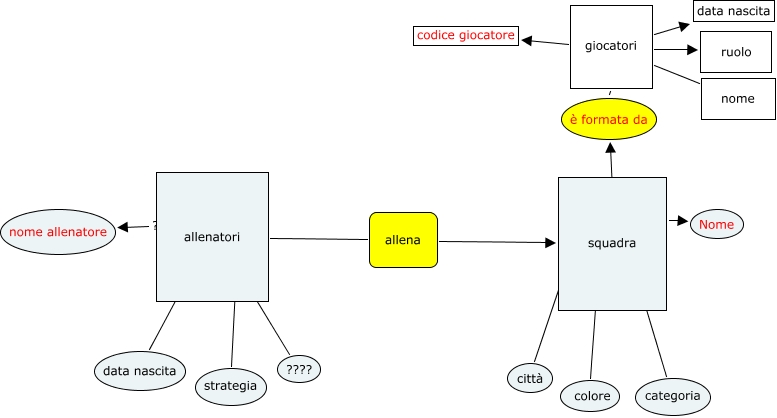Questa Cmap, creata con IHMC CmapTools, contiene informazioni relative a: calciatori. lorenzo pecis, allenatori ???? ????, squadra ???? Nome, squadra ???? categoria, è formata da giocatori codice giocatore, squadra ???? città, squadra ???? colore, è formata da giocatori ruolo, allenatori ???? data nascita, allenatori ???? strategia, squadra ???? è formata da, è formata da giocatori nome, è formata da giocatori data nascita, allenatori allena squadra, allenatori ???? nome allenatore