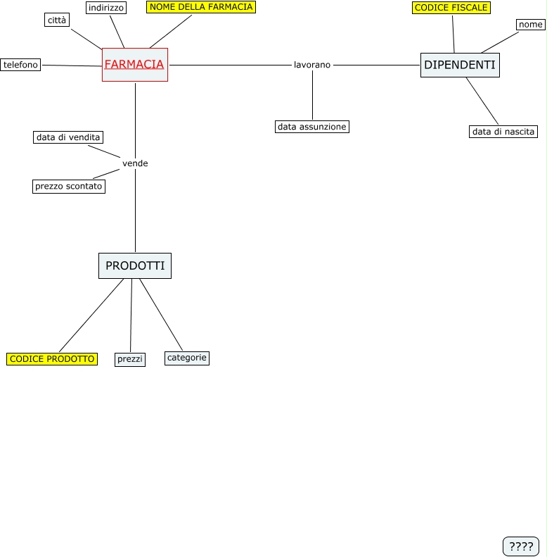 Questa Cmap, creata con IHMC CmapTools, contiene informazioni relative a: FARMACIA ELE!!, PRODOTTI ???? CODICE PRODOTTO, FARMACIA lavorano DIPENDENTI, PRODOTTI ???? categorie, FARMACIA ???? telefono, PRODOTTI ???? prezzi, FARMACIA ???? NOME DELLA FARMACIA, FARMACIA ???? indirizzo, DIPENDENTI ???? nome, FARMACIA vende prezzo scontato, FARMACIA vende data di vendita, DIPENDENTI ???? data di nascita, DIPENDENTI ???? CODICE FISCALE, FARMACIA vende PRODOTTI, FARMACIA ???? città, FARMACIA lavorano data assunzione