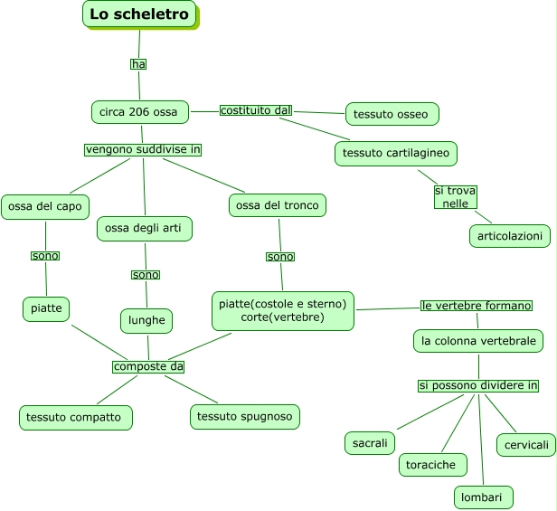 Questa Cmap, creata con IHMC CmapTools, contiene informazioni relative a: Lo scheletro, piatte(costole e sterno) corte(vertebre) composte da tessuto spugnoso, circa 206 ossa vengono suddivise in ossa del tronco, circa 206 ossa costituito dal tessuto cartilagineo, la colonna vertebrale si possono dividere in cervicali, piatte composte da tessuto compatto, la colonna vertebrale si possono dividere in sacrali, Lo scheletro ha circa 206 ossa, ossa degli arti sono lunghe, piatte(costole e sterno) corte(vertebre) composte da tessuto compatto, la colonna vertebrale le vertebre formano piatte(costole e sterno) corte(vertebre), lunghe composte da tessuto spugnoso, circa 206 ossa costituito dal tessuto osseo, circa 206 ossa vengono suddivise in ossa degli arti, lunghe composte da tessuto compatto, la colonna vertebrale si possono dividere in toraciche, circa 206 ossa vengono suddivise in ossa del capo, tessuto cartilagineo si trova nelle articolazioni, piatte composte da tessuto spugnoso, la colonna vertebrale si possono dividere in lombari, ossa del tronco sono piatte(costole e sterno) corte(vertebre)