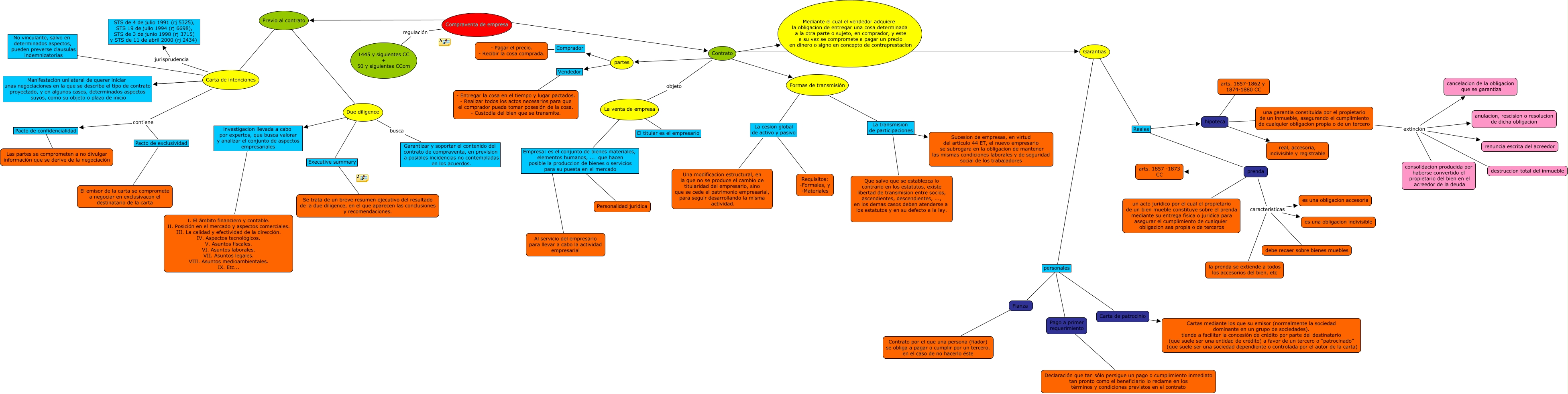Este Cmap, tiene información relacionada con: Escenario 2, hipoteca ???? una garantia constituida por el propietario de un inmueble, asegurando el cumplimiento de cualquier obligacion propia o de un tercero, Contrato ???? Garantias, Due diligence ???? investigacion llevada a cabo por expertos, que busca valorar y analizar el conjunto de aspectos empresariales, personales ???? Pago a primer requerimiento, La venta de empresa ???? El titular es el empresario, prenda ???? arts. 1857 -1873 CC, hipoteca ???? arts. 1857-1862 y 1874-1880 CC, Due diligence busca Garantizar y soportar el contenido del contrato de compraventa, en prevision a posibles incidencias no contempladas en los acuerdos., partes ???? Vendedor, La cesion global de activo y pasivo ???? Requisitos: -Formales, y -Materiales, Comprador ???? - Pagar el precio. - Recibir la cosa comprada., Garantias ???? Reales, una garantia constituida por el propietario de un inmueble, asegurando el cumplimiento de cualquier obligacion propia o de un tercero extinción consolidacion producida por haberse convertido el propietario del bien en el acreedor de la deuda, prenda ???? un acto juridico por el cual el propietario de un bien mueble constituye sobre el prenda mediante su entrega fisica o juridica para asegurar el cumplimiento de cualquier obligacion sea propia o de terceros, Carta de intenciones contiene Pacto de exclusividad, una garantia constituida por el propietario de un inmueble, asegurando el cumplimiento de cualquier obligacion propia o de un tercero extinción cancelacion de la obligacion que se garantiza, una garantia constituida por el propietario de un inmueble, asegurando el cumplimiento de cualquier obligacion propia o de un tercero extinción renuncia escrita del acreedor, investigacion llevada a cabo por expertos, que busca valorar y analizar el conjunto de aspectos empresariales ???? I. El ámbito financiero y contable. II. Posición en el mercado y aspectos comerciales. III. La calidad y efectividad de la dirección. IV. Aspectos tecnológicos. V. Asuntos fiscales. VI. Asuntos laborales. VII. Asuntos legales. VIII. Asuntos medioambientales. IX. Etc..., prenda características es una obligacion indivisible, Due diligence resultado Executive summary