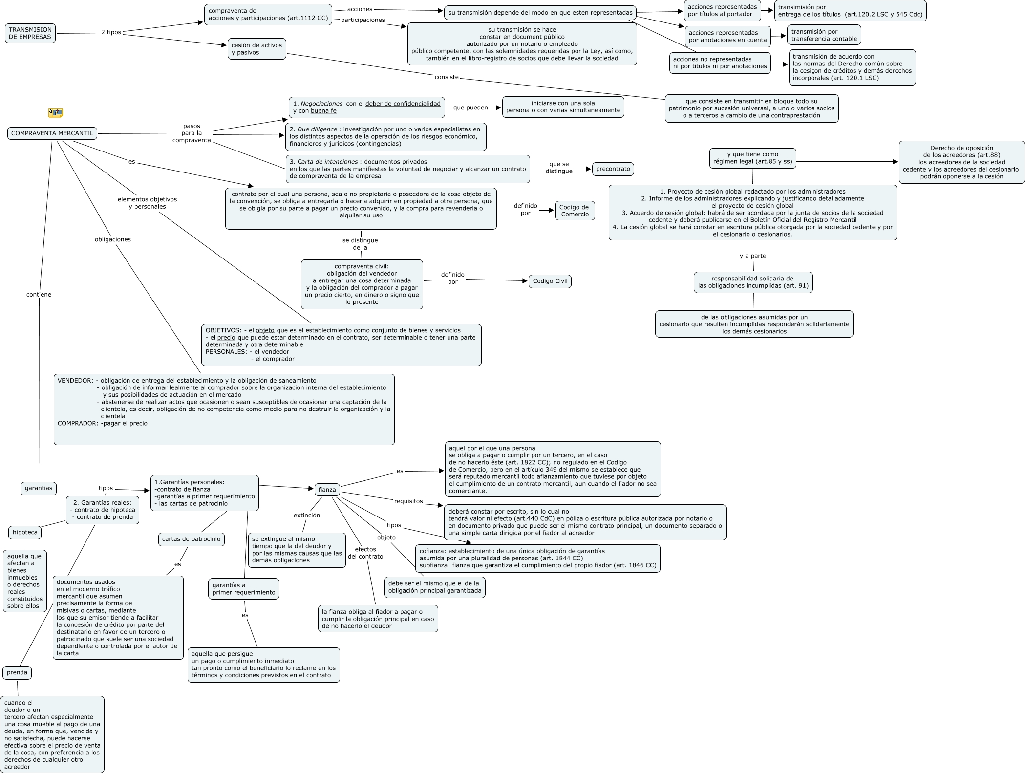 Este Cmap, tiene información relacionada con: cmaps 2, responsabilidad solidaria de las obligaciones incumplidas (art. 91) ???? de las obligaciones asumidas por un cesionario que resulten incumplidas responderán solidariamente los demás cesionarios, fianza es aquel por el que una persona se obliga a pagar o cumplir por un tercero, en el caso de no hacerlo éste (art. 1822 CC); no regulado en el Codigo de Comercio, pero en el artículo 349 del mismo se establece que será reputado mercantil todo afianzamiento que tuviese por objeto el cumplimiento de un contrato mercantil, aun cuando el fiador no sea comerciante., acciones representadas por títulos al portador ???? transimisión por entrega de los títulos (art.120.2 LSC y 545 Cdc), TRANSMISION DE EMPRESAS 2 tipos compraventa de acciones y participaciones (art.1112 CC), contrato por el cual una persona, sea o no propietaria o poseedora de la cosa objeto de la convención, se obliga a entregarla o hacerla adquirir en propiedad a otra persona, que se obigla por su parte a pagar un precio convenido, y la compra para revenderla o alquilar su uso definido por Codigo de Comercio, su transmisión depende del modo en que esten representadas ???? acciones no representadas ni por titulos ni por anotaciones, 1. Proyecto de cesión global redactado por los administradores 2. Informe de los administradores explicando y justificando detalladamente el proyecto de cesión global 3. Acuerdo de cesión global: habrá de ser acordada por la junta de socios de la sociedad cedente y deberá publicarse en el Boletín Oficial del Registro Mercantil 4. La cesión global se hará constar en escritura pública otorgada por la sociedad cedente y por el cesionario o cesionarios. y a parte responsabilidad solidaria de las obligaciones incumplidas (art. 91), prenda es cuando el deudor o un tercero afectan especialmente una cosa mueble al pago de una deuda, en forma que, vencida y no satisfecha, puede hacerse efectiva sobre el precio de venta de la cosa, con preferencia a los derechos de cualquier otro acreedor, su transmisión depende del modo en que esten representadas ???? acciones representadas por títulos al portador, fianza objeto debe ser el mismo que el de la obligación principal garantizada, su transmisión depende del modo en que esten representadas ???? acciones representadas por anotaciones en cuenta, fianza efectos del contrato la fianza obliga al fiador a pagar o cumplir la obligación principal en caso de no hacerlo el deudor, fianza extinción se extingue al mismo tiempo que la del deudor y por las mismas causas que las demás obligaciones, garantias tipos 2. Garantías reales: - contrato de hipoteca - contrato de prenda, garantias tipos 1.Garantías personales: -contrato de fianza -garantías a primer requerimiento - las cartas de patrocinio, 2. Garantías reales: - contrato de hipoteca - contrato de prenda ???? hipoteca, compraventa de acciones y participaciones (art.1112 CC) participaciones su transmisión se hace constar en document público autorizado por un notario o empleado público competente, con las solemnidades requeridas por la Ley, así como, también en el libro-registro de socios que debe llevar la sociedad, COMPRAVENTA MERCANTIL pasos para la compraventa 3. Carta de intenciones: documentos privados en los que las partes manifiestas la voluntad de negociar y alcanzar un contrato de compraventa de la empresa, cesión de activos y pasivos consiste ????, hipoteca es aquella que afectan a bienes inmuebles o derechos reales constituidos sobre ellos