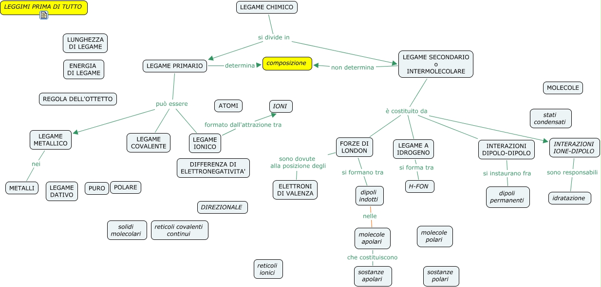 Questa Cmap, creata con IHMC CmapTools, contiene informazioni relative a: legamiConcetti, LEGAME SECONDARIO o INTERMOLECOLARE non determina composizione, LEGAME CHIMICO si divide in LEGAME SECONDARIO o INTERMOLECOLARE, LEGAME SECONDARIO o INTERMOLECOLARE è costituito da INTERAZIONI DIPOLO-DIPOLO, INTERAZIONI DIPOLO-DIPOLO si instaurano fra dipoli permanenti, FORZE DI LONDON sono dovute alla posizione degli ELETTRONI DI VALENZA, LEGAME PRIMARIO determina composizione, LEGAME CHIMICO si divide in LEGAME PRIMARIO, LEGAME PRIMARIO può essere LEGAME COVALENTE, LEGAME SECONDARIO o INTERMOLECOLARE è costituito da INTERAZIONI IONE-DIPOLO, FORZE DI LONDON si formano tra dipoli indotti, LEGAME PRIMARIO può essere LEGAME METALLICO, INTERAZIONI IONE-DIPOLO sono responsabili idratazione, LEGAME IONICO formato dall'attrazione tra IONI, LEGAME SECONDARIO o INTERMOLECOLARE è costituito da LEGAME A IDROGENO, LEGAME PRIMARIO può essere LEGAME IONICO, LEGAME SECONDARIO o INTERMOLECOLARE è costituito da FORZE DI LONDON, LEGAME A IDROGENO si forma tra H-FON, dipoli indotti nelle molecole apolari, molecole apolari che costituiscono sostanze apolari, LEGAME METALLICO nei METALLI