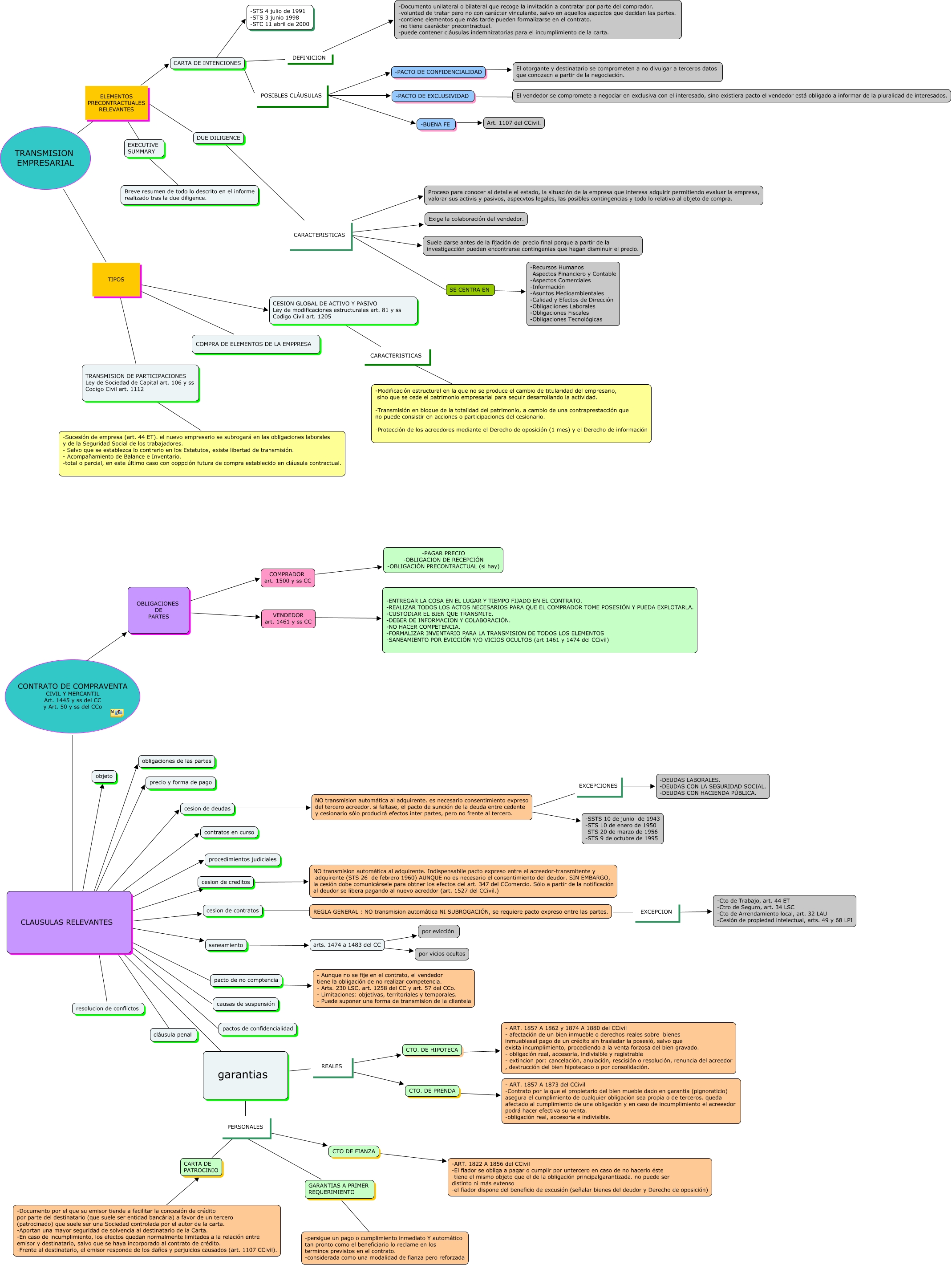 Este Cmap, tiene información relacionada con: Escenario 2 - La Repartidora, CLAUSULAS RELEVANTES ???? cesion de deudas, TRANSMISION EMPRESARIAL TIPOS COMPRA DE ELEMENTOS DE LA EMPPRESA, CLAUSULAS RELEVANTES ???? contratos en curso, pacto de no comptencia ???? - Aunque no se fije en el contrato, el vendedor tiene la obligación de no realizar competencia. - Arts. 230 LSC, art. 1258 del CC y art. 57 del CCo. - Limitaciones: objetivas, territoriales y temporales. - Puede suponer una forma de transmision de la clientela, CLAUSULAS RELEVANTES ???? precio y forma de pago, CLAUSULAS RELEVANTES ???? pacto de no comptencia, CONTRATO DE COMPRAVENTA CIVIL Y MERCANTIL Art. 1445 y ss del CC y Art. 50 y ss del CCo ???? OBLIGACIONES DE PARTES, TRANSMISION EMPRESARIAL TIPOS TRANSMISION DE PARTICIPACIONES Ley de Sociedad de Capital art. 106 y ss Codigo Civil art. 1112, -PACTO DE EXCLUSIVIDAD ???? El vendedor se compromete a negociar en exclusiva con el interesado, sino existiera pacto el vendedor está obligado a informar de la pluralidad de interesados., DUE DILIGENCE CARACTERISTICAS Proceso para conocer al detalle el estado, la situación de la empresa que interesa adquirir permitiendo evaluar la empresa, valorar sus activis y pasivos, aspecvtos legales, las posibles contingencias y todo lo relativo al objeto de compra., TRANSMISION EMPRESARIAL ELEMENTOS PRECONTRACTUALES RELEVANTES EXECUTIVE SUMMARY, -PACTO DE CONFIDENCIALIDAD ???? El otorgante y destinatario se comprometen a no divulgar a terceros datos que conozacn a partir de la negociación., CLAUSULAS RELEVANTES ???? cláusula penal, CLAUSULAS RELEVANTES ???? procedimientos judiciales, garantias REALES CTO. DE HIPOTECA, CLAUSULAS RELEVANTES ???? garantias, OBLIGACIONES DE PARTES ???? COMPRADOR art. 1500 y ss CC, CLAUSULAS RELEVANTES ???? pactos de confidencialidad, CESION GLOBAL DE ACTIVO Y PASIVO Ley de modificaciones estructurales art. 81 y ss Codigo Civil art. 1205 CARACTERISTICAS -Modificación estructural en la que no se produce el cambio de titularidad del empresario, sino que se cede el patrimonio empresarial para seguir desarrollando la actividad. -Transmisión en bloque de la totalidad del patrimonio, a cambio de una contraprestacción que no puede consistir en acciones o participaciones del cesionario. -Protección de los acreedores mediante el Derecho de oposición (1 mes) y el Derecho de información, cesion de deudas ???? NO transmision automática al adquirente. es necesario consentimiento expreso del tercero acreedor. si faltase, el pacto de sunción de la deuda entre cedente y cesionario sólo producirá efectos inter partes, pero no frente al tercero.
