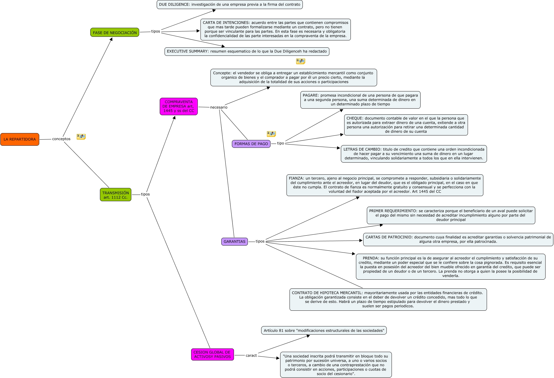Este Cmap, tiene información relacionada con: ESCENARIO 2, FORMAS DE PAGO tipo PAGARE: promesa incondicional de una persona de que pagara a una segunda persona, una suma determinada de dinero en un determinado plazo de tiempo, GARANTIAS tipos CONTRATO DE HIPOTECA MERCANTIL: mayoritariamente usada por las entidades financieras de crédito. La obligación garantizada consiste en el deber de devolver un crédito concedido, mas todo lo que se derive de esto. Habrá un plazo de tiempo estipulado para devolver el dinero prestado y suelen ser pagos periodicos., FASE DE NEGOCIACIÓN tipos DUE DILIGENCE: investigación de una empresa previa a la firma del contrato, TRANSMISIÓN art. 1112 Cc. tipos CESION GLOBAL DE ACTIVOSY PASIVOS, CESION GLOBAL DE ACTIVOSY PASIVOS caract "Una sociedad inscrita podrá transmitir en bloque todo su patrimonio por sucesión universa, a uno o varios socios o terceros, a cambio de una contraprestación que no podrá consistir en acciones, participaciones o cuotas de socio del cesionario"., FASE DE NEGOCIACIÓN tipos CARTA DE INTENCIONES: acuerdo entre las partes que contienen compromisos que mas tarde pueden formalizarse mediante un contrato, pero no tienen porque ser vinculante para las partes. En esta fase es necesaria y obligatoria la confidencialidad de las parte interesadas en la compraventa de la empresa., LA REPARTIDORA conceptos TRANSMISIÓN art. 1112 Cc., COMPRAVENTA DE EMPRESA art, 1445 y ss del CC necesario Concepte: el vendedor se obliga a entregar un establicimiento mercantil como conjunto organico de bienes y el comprador a pagar por él un precio cierto, mediante la adquisición de la totalidad de sus acciones o participaciones, GARANTIAS tipos PRIMER REQUERIMIENTO: se caracteriza porque el beneficiario de un aval puede solicitar el pago del mismo sin necesidad de acreditar incumplimiento alguno por parte del deudor principal, TRANSMISIÓN art. 1112 Cc. tipos COMPRAVENTA DE EMPRESA art, 1445 y ss del CC, COMPRAVENTA DE EMPRESA art, 1445 y ss del CC necesario GARANTIAS, FORMAS DE PAGO tipo LETRAS DE CAMBIO: titulo de credito que contiene una orden incondicionada de hacer pagar a su vencimiento una suma de dinero en un lugar determinado, vinculando solidariamente a todos los que en ella intervienen., FORMAS DE PAGO tipo CHEQUE: documento contable de valor en el que la persona que es autorizada para extraer dinero de una cuenta, extiende a otra persona una autorización para retirar una determinada cantidad de dinero de su cuenta, COMPRAVENTA DE EMPRESA art, 1445 y ss del CC necesario FORMAS DE PAGO, FASE DE NEGOCIACIÓN tipos EXECUTIVE SUMMARY: resumen esquematico de lo que la Due Diligenceh ha redactado, LA REPARTIDORA conceptos FASE DE NEGOCIACIÓN, GARANTIAS tipos PRENDA: su función principal es la de asegurar al acreedor el cumplimiento y satisfacción de su credito, mediante un poder especial que se le confiere sobre la cosa pignorada. Es requisito esencial la puesta en posesión del acreedor del bien mueble ofrecido en garantía del credito, que puede ser propiedad de un deudor o de un tercero. La prenda no otorga a quien la posee la posibilidad de venderla., CESION GLOBAL DE ACTIVOSY PASIVOS caract Artículo 81 sobre "modificaciones estructurales de las sociedades", GARANTIAS tipos CARTAS DE PATROCINIO: documento cuya finalidad es acreditar garantias o solvencia patrimonial de alguna otra empresa, por ella patrocinada., GARANTIAS tipos FIANZA: un tercero, ajeno al negocio principal, se compromete a responder, subsidiaria o solidariamente del cumplimiento ante el acreedor, en lugar del deudor, que es el obligado principal, en el caso en que éste no cumpla. El contrato de fianza es normalmente gratuito y consensual y se perfecciona con la voluntad del fiador aceptada por el acreedor. Art 1445 del CC