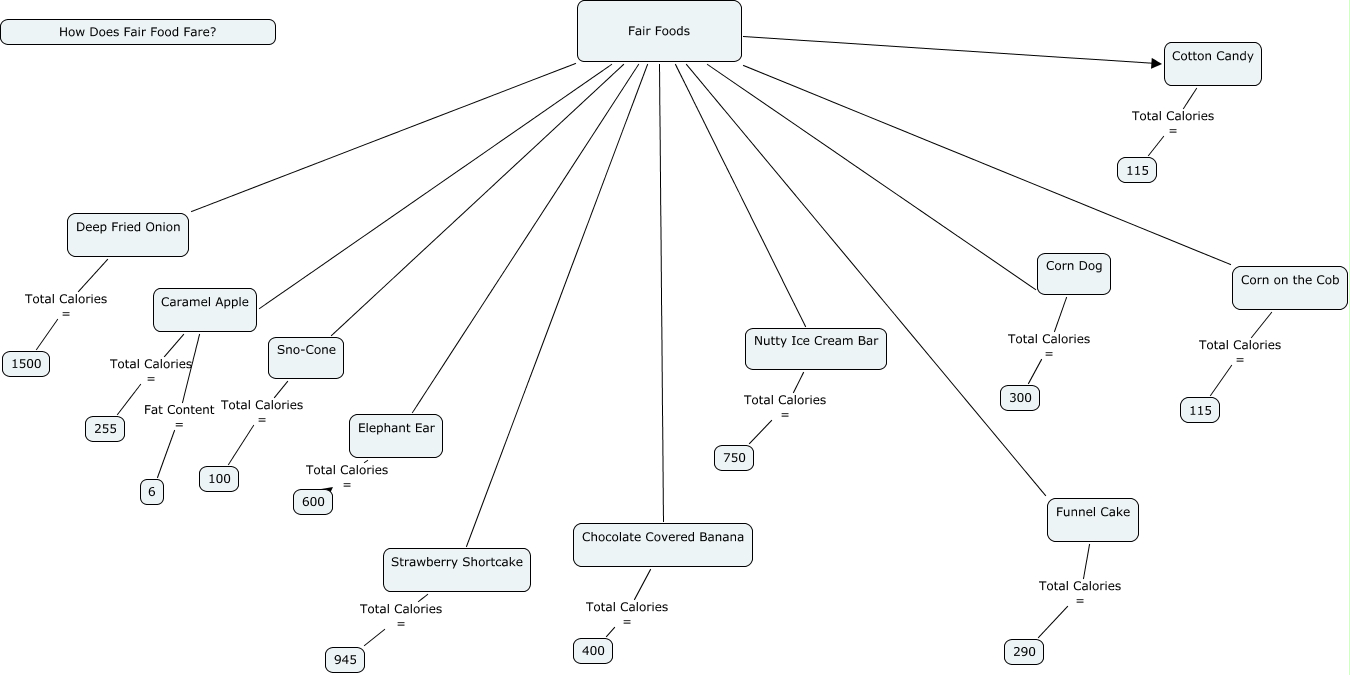 This Concept Map, created with IHMC CmapTools, has information related to: fair food fair map.cmap, Caramel Apple Total Calories = 255, Fair Foods Cotton Candy, Fair Foods Sno-Cone, Fair Foods Nutty Ice Cream Bar, Corn Dog Total Calories = 300, Fair Foods Corn on the Cob, Corn on the Cob Total Calories = 115, Funnel Cake Total Calories = 290, Sno-Cone Total Calories = 100, Fair Foods Funnel Cake, Fair Foods Strawberry Shortcake, Fair Foods Chocolate Covered Banana, Cotton Candy Total Calories = 115, Deep Fried Onion Total Calories = 1500, Strawberry Shortcake Total Calories = 945, Fair Foods Corn Dog, Caramel Apple Fat Content = 6, Fair Foods Caramel Apple, Fair Foods Deep Fried Onion, Chocolate Covered Banana Total Calories = 400