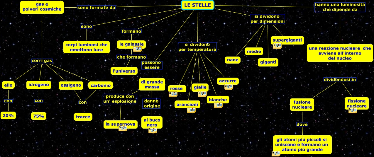 Questa Cmap, creata con IHMC CmapTools, contiene informazioni relative a: le stelle, elio con 20%, di grande massa produce con un' esplosione la supernova, LE STELLE si dividono per dimensioni medie, una reazione nucleare che avviene all'interno del nucleo dividendosi in fissione nucleare, idrogeno con 75%, le galassie che formano l'universo, LE STELLE si dividono per temperatura gialle, ossigeno con tracce, carbonio con tracce, LE STELLE si dividono per temperatura bianche, fusione nucleare dove gli atomi più piccoli si uniscono e formano un atomo più grande, LE STELLE formano le galassie, LE STELLE si dividono per dimensioni giganti, gas e polveri cosmiche con i gas idrogeno, gas e polveri cosmiche con i gas ossigeno, LE STELLE si dividono per dimensioni supergiganti, LE STELLE sono formate da gas e polveri cosmiche, LE STELLE si dividono per temperatura arancioni, LE STELLE si dividono per dimensioni nane, LE STELLE si dividono per temperatura rosse