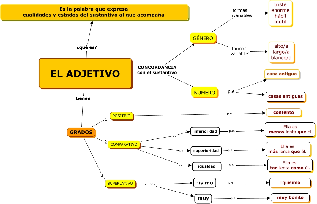 Este Cmap, tiene información relacionada con: adjetivo_quintoEP, igualdad p.e. Ella es tan lenta como él., SUPERLATIVO 2 tipos muy, GÉNERO formas invariables triste enorme hábil inútil, NÚMERO p.e casa antigua, superioridad p.e Ella es más lenta que él., EL ADJETIVO ¿qué es? Es la palabra que expresa cualidades y estados del sustantivo al que acompaña, inferioridad p.e. Ella es menos lenta que él., EL ADJETIVO CONCORDANCIA con el sustantivo NÚMERO, GÉNERO formas variables alto/a largo/a blanco/a, EL ADJETIVO tienen GRADOS, COMPARATIVO de inferioridad, NÚMERO p.e casas antiguas, GRADOS 2 COMPARATIVO, GRADOS 3 SUPERLATIVO, muy p.e muy bonito, -ísimo p.e. riquísimo, COMPARATIVO de igualdad, SUPERLATIVO 2 tipos -ísimo, GRADOS 1 POSITIVO, COMPARATIVO de superioridad