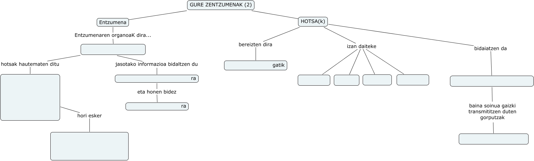 IHMC CmapTools-ekin sortu den kontzeptu-mapa honek honi buruzko informazioa du: Gure zentzumenak (2) Entzumena-Hotsa (Zuria), HOTSA(k) izan daiteke, HOTSA(k) bidaiatzen da, HOTSA(k) izan daiteke, ra eta honen bidez ra, Entzumena Entzumenaren organoaK dira..., GURE ZENTZUMENAK (2) ???? Entzumena, jasotako informazioa bidaltzen du ra, hori esker, hotsak hautematen ditu, HOTSA(k) izan daiteke, HOTSA(k) bereizten dira gatik, baina soinua gaizki transmititzen duten gorputzak, HOTSA(k) izan daiteke, GURE ZENTZUMENAK (2) ???? HOTSA(k)