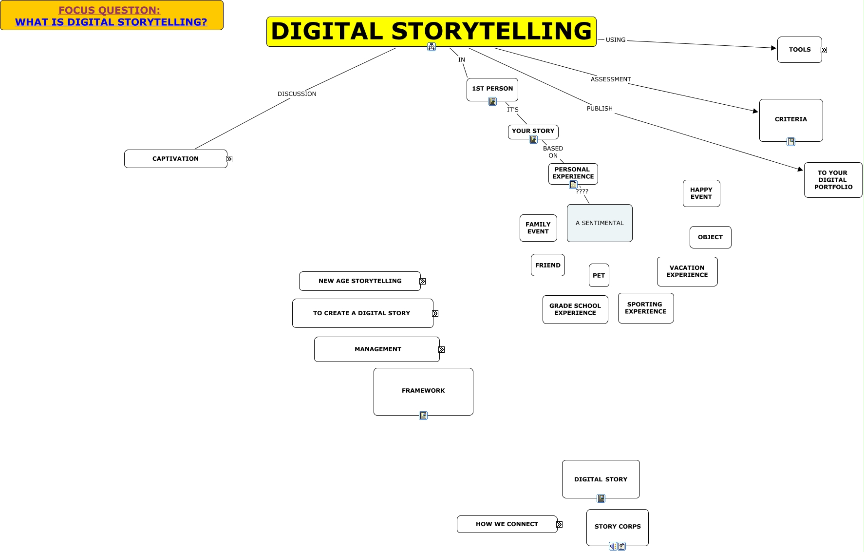This Concept Map, created with IHMC CmapTools, has information related to: DS PARKING LOT, TABLE OF TASKS ASSIGN TASK DUE DATES, DIGITAL STORYTELLING ASSESSMENT CRITERIA, DIGITAL STORYTELLING IN 1ST PERSON, DIGITAL STORYTELLING USING TOOLS, DIGITAL STORYTELLING PUBLISH TO YOUR DIGITAL PORTFOLIO, PROJECT MANAGEMENT MILESTONES TABLE OF TASKS, PROJECT MANAGEMENT MILESTONES COMPLETION DATE DECEMBER 4, 2012, PROJECT MANAGEMENT CREATE "DIGITAL STORY FOLDER" WITHIN YOUR "CT FOLDER", YOUR STORY BASED ON PERSONAL EXPERIENCE, 1ST PERSON IT'S YOUR STORY, PROJECT MANAGEMENT MILESTONES COMMENCEMENT DATE NOVEMBER 5, 2012, PERSONAL EXPERIENCE ???? A SENTIMENTAL, DIGITAL STORYTELLING DISCUSSION CAPTIVATION