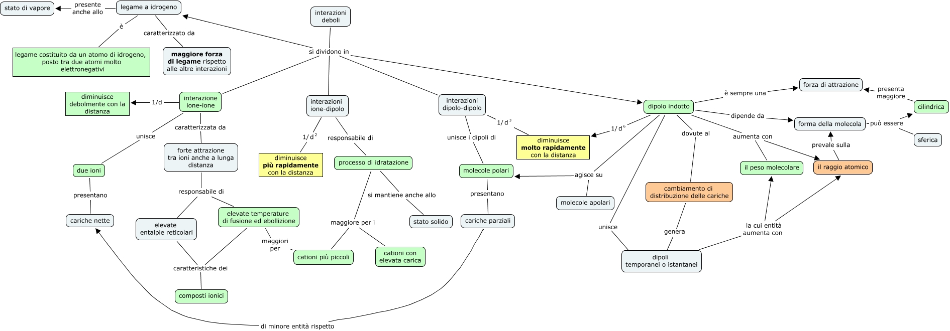Questa Cmap, creata con IHMC CmapTools, contiene informazioni relative a: beatrice g, dipolo indotto agisce su molecole polari, interazioni dipolo-dipolo <math xmlns="http://www.w3.org/1998/Math/MathML"> <mrow> <mtext> 1/ </mtext> <mmultiscripts> <mtext> d </mtext> <none/> <mtext> 3 </mtext> </mmultiscripts> </mrow> </math> diminuisce molto rapidamente con la distanza, interazioni dipolo-dipolo unisce i dipoli di molecole polari, legame a idrogeno caratterizzato da maggiore forza di legame rispetto alle altre interazioni, interazioni ione-dipolo <math xmlns="http://www.w3.org/1998/Math/MathML"> <mrow> <mtext> 1/ </mtext> <mmultiscripts> <mtext> d </mtext> <none/> <mtext> 2 </mtext> </mmultiscripts> </mrow> </math> diminuisce più rapidamente con la distanza, processo di idratazione si mantiene anche allo stato solido, cilindrica presenta maggiore forza di attrazione, dipolo indotto agisce su molecole apolari, interazione ione-ione 1/d diminuisce debolmente con la distanza, forte attrazione tra ioni anche a lunga distanza responsabile di elevate entalpie reticolari, dipolo indotto dovute al cambiamento di distribuzione delle cariche, dipolo indotto è sempre una forza di attrazione, forma della molecola può essere sferica, dipolo indotto <math xmlns="http://www.w3.org/1998/Math/MathML"> <mrow> <mtext> 1/ </mtext> <mmultiscripts> <mtext> d </mtext> <none/> <mtext> 6 </mtext> </mmultiscripts> </mrow> </math> diminuisce molto rapidamente con la distanza, interazioni deboli si dividono in interazioni ione-dipolo, interazioni deboli si dividono in dipolo indotto, forma della molecola può essere cilindrica, due ioni presentano cariche nette, interazione ione-ione unisce due ioni, dipolo indotto unisce ????