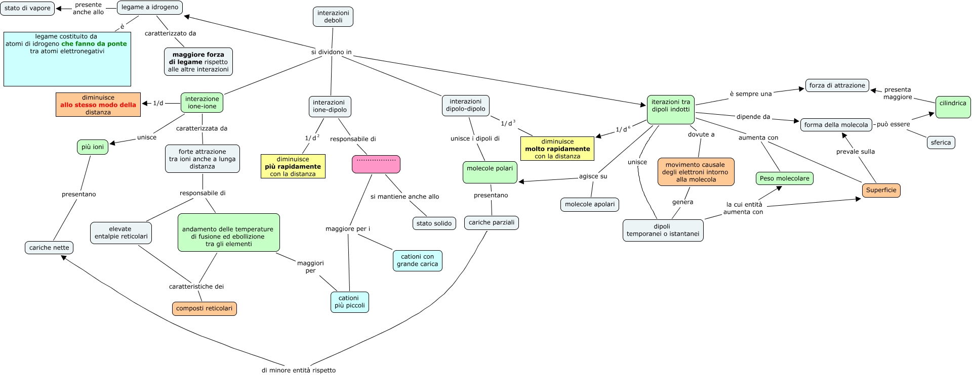Questa Cmap, creata con IHMC CmapTools, contiene informazioni relative a: riccardo m, interazioni dipolo-dipolo <math xmlns="http://www.w3.org/1998/Math/MathML"> <mrow> <mtext> 1/ </mtext> <mmultiscripts> <mtext> d </mtext> <none/> <mtext> 3 </mtext> </mmultiscripts> </mrow> </math> diminuisce molto rapidamente con la distanza, iterazioni tra dipoli indotti agisce su molecole polari, interazioni ione-dipolo <math xmlns="http://www.w3.org/1998/Math/MathML"> <mrow> <mtext> 1/ </mtext> <mmultiscripts> <mtext> d </mtext> <none/> <mtext> 2 </mtext> </mmultiscripts> </mrow> </math> diminuisce più rapidamente con la distanza, legame a idrogeno caratterizzato da maggiore forza di legame rispetto alle altre interazioni, interazioni dipolo-dipolo unisce i dipoli di molecole polari, .................. si mantiene anche allo stato solido, iterazioni tra dipoli indotti agisce su molecole apolari, cilindrica presenta maggiore forza di attrazione, interazione ione-ione 1/d diminuisce allo stesso modo della distanza, iterazioni tra dipoli indotti dovute a movimento causale degli elettroni intorno alla molecola, forte attrazione tra ioni anche a lunga distanza responsabile di elevate entalpie reticolari, iterazioni tra dipoli indotti è sempre una forza di attrazione, forma della molecola può essere sferica, interazioni deboli si dividono in interazioni ione-dipolo, iterazioni tra dipoli indotti <math xmlns="http://www.w3.org/1998/Math/MathML"> <mrow> <mtext> 1/ </mtext> <mmultiscripts> <mtext> d </mtext> <none/> <mtext> 6 </mtext> </mmultiscripts> </mrow> </math> diminuisce molto rapidamente con la distanza, interazioni deboli si dividono in iterazioni tra dipoli indotti, forma della molecola può essere cilindrica, interazione ione-ione unisce più ioni, più ioni presentano cariche nette, iterazioni tra dipoli indotti unisce dipoli temporanei o istantanei