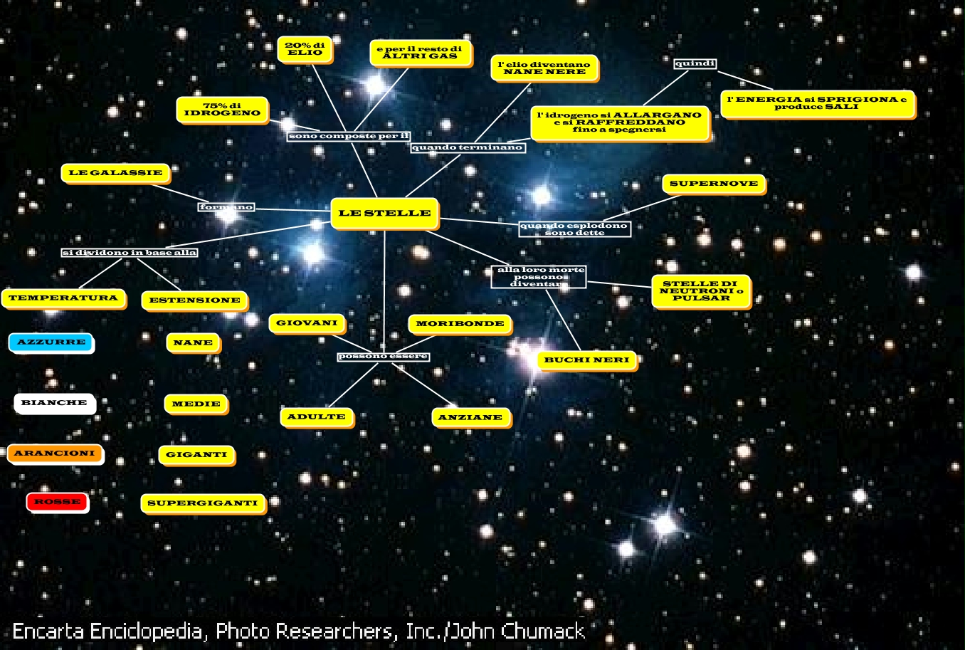 Questa Cmap, creata con IHMC CmapTools, contiene informazioni relative a: LE STELLE, LE STELLE formano LE GALASSIE, LE STELLE quando terminano l' idrogeno si ALLARGANO e si RAFFREDDANO fino a spegnersi, LE STELLE possono essere GIOVANI, l' idrogeno si ALLARGANO e si RAFFREDDANO fino a spegnersi quindi l' ENERGIA si SPRIGIONA e produce SALI, LE STELLE si dividono in base alla ESTENSIONE, LE STELLE possono essere ANZIANE, LE STELLE sono composte per il 20% di ELIO, LE STELLE si dividono in base alla TEMPERATURA, LE STELLE quando esplodono sono dette SUPERNOVE, LE STELLE possono essere ADULTE, LE STELLE alla loro morte possono diventare STELLE DI NEUTRONI o PULSAR, LE STELLE possono essere MORIBONDE, LE STELLE quando terminano l' elio diventano NANE NERE, LE STELLE sono composte per il e per il resto di ALTRI GAS, LE STELLE sono composte per il 75% di IDROGENO, LE STELLE alla loro morte possono diventare BUCHI NERI