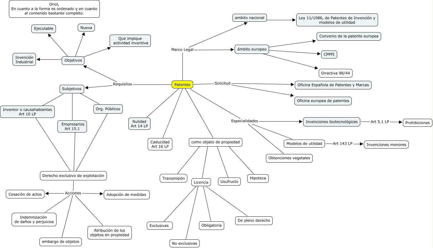 Este Cmap, tiene información relacionada con: Patentes y protección de otras creaciones.cmap, Patentes ???? como objeto de propiedad, Patentes Solicitud Oficina Española de Patentes y Marcas, Licencia ???? No exclusivas, Objetivos ???? Ejecutable, Patentes Marco Legal ambito nacional, ambito nacional ???? Ley 11/1986, de Patentes de Invención y modelos de utilidad, Derecho exclusivo de explotación Acciones embargo de objetos, ámbito europeo ???? Directiva 98/44, Licencia ???? Exclusivas, Invenciones biotecnológicas Art 5.1 LP Prohibiciones, ámbito europeo ???? CPPPI, Inventor o causahabientes Art 10 LP ???? Derecho exclusivo de explotación, Subjetivos ???? Empresarios Art 15.1, Derecho exclusivo de explotación Acciones Adopción de medidas, Derecho exclusivo de explotación Acciones Indemnización de daños y perjuicios, Patentes ???? Caducidad Art 16 LP, Patentes Solicitud Oficina europea de patentes, Subjetivos ???? Org. Públicos, Licencia ???? De pleno derecho, Org. Públicos ???? Derecho exclusivo de explotación