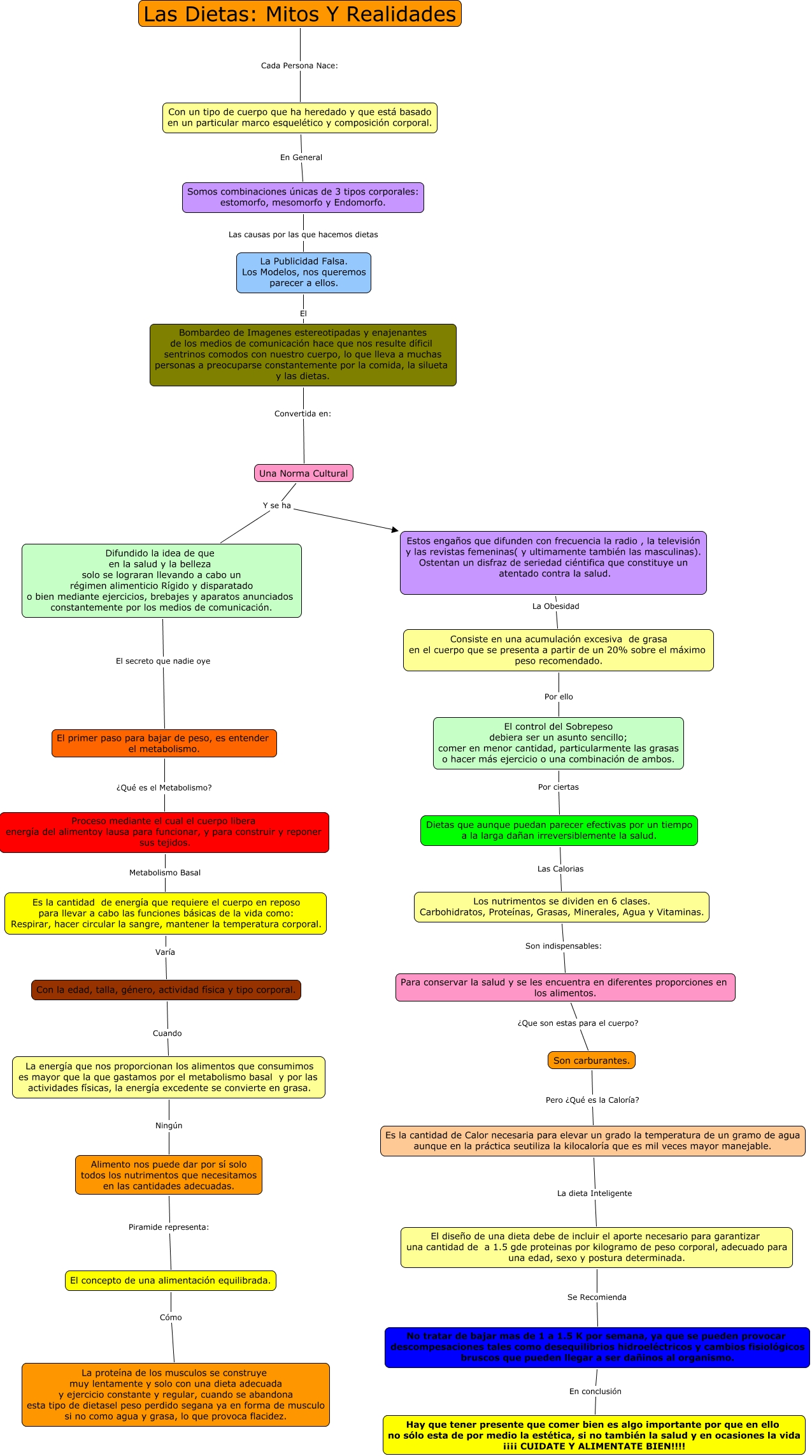 Este Cmap, tiene información relacionada con: Las dietas Mitos y Verdades, Los nutrimentos se dividen en 6 clases. Carbohidratos, Proteínas, Grasas, Minerales, Agua y Vitaminas. Son indispensables: Para conservar la salud y se les encuentra en diferentes proporciones en los alimentos., El diseño de una dieta debe de incluir el aporte necesario para garantizar una cantidad de a 1.5 gde proteinas por kilogramo de peso corporal, adecuado para una edad, sexo y postura determinada. Se Recomienda No tratar de bajar mas de 1 a 1.5 K por semana, ya que se pueden provocar descompesaciones tales como desequilibrios hidroeléctricos y cambios fisiológicos bruscos que pueden llegar a ser dañinos al organismo., Es la cantidad de energía que requiere el cuerpo en reposo para llevar a cabo las funciones básicas de la vida como: Respirar, hacer circular la sangre, mantener la temperatura corporal. Varía Con la edad, talla, género, actividad física y tipo corporal., Es la cantidad de Calor necesaria para elevar un grado la temperatura de un gramo de agua aunque en la práctica seutiliza la kilocaloría que es mil veces mayor manejable. La dieta Inteligente El diseño de una dieta debe de incluir el aporte necesario para garantizar una cantidad de a 1.5 gde proteinas por kilogramo de peso corporal, adecuado para una edad, sexo y postura determinada., Para conservar la salud y se les encuentra en diferentes proporciones en los alimentos. ¿Que son estas para el cuerpo? Son carburantes., Con la edad, talla, género, actividad física y tipo corporal. Cuando La energía que nos proporcionan los alimentos que consumimos es mayor que la que gastamos por el metabolismo basal y por las actividades físicas, la energía excedente se convierte en grasa., El control del Sobrepeso debiera ser un asunto sencillo; comer en menor cantidad, particularmente las grasas o hacer más ejercicio o una combinación de ambos. Por ciertas Dietas que aunque puedan parecer efectivas por un tiempo a la larga dañan irreversiblemente la salud., Somos combinaciones únicas de 3 tipos corporales: estomorfo, mesomorfo y Endomorfo. Las causas por las que hacemos dietas La Publicidad Falsa. Los Modelos, nos queremos parecer a ellos., Con un tipo de cuerpo que ha heredado y que está basado en un particular marco esquelético y composición corporal. En General Somos combinaciones únicas de 3 tipos corporales: estomorfo, mesomorfo y Endomorfo., El primer paso para bajar de peso, es entender el metabolismo. ¿Qué es el Metabolismo? Proceso mediante el cual el cuerpo libera energía del alimentoy lausa para funcionar, y para construir y reponer sus tejidos., Las Dietas: Mitos Y Realidades Cada Persona Nace: Con un tipo de cuerpo que ha heredado y que está basado en un particular marco esquelético y composición corporal., Consiste en una acumulación excesiva de grasa en el cuerpo que se presenta a partir de un 20% sobre el máximo peso recomendado. Por ello El control del Sobrepeso debiera ser un asunto sencillo; comer en menor cantidad, particularmente las grasas o hacer más ejercicio o una combinación de ambos., Estos engaños que difunden con frecuencia la radio , la televisión y las revistas femeninas( y ultimamente también las masculinas). Ostentan un disfraz de seriedad ciéntifica que constituye un atentado contra la salud. La Obesidad Consiste en una acumulación excesiva de grasa en el cuerpo que se presenta a partir de un 20% sobre el máximo peso recomendado., El concepto de una alimentación equilibrada. Cómo La proteína de los musculos se construye muy lentamente y solo con una dieta adecuada y ejercicio constante y regular, cuando se abandona esta tipo de dietasel peso perdido segana ya en forma de musculo si no como agua y grasa, lo que provoca flacidez., Dietas que aunque puedan parecer efectivas por un tiempo a la larga dañan irreversiblemente la salud. Las Calorias Los nutrimentos se dividen en 6 clases. Carbohidratos, Proteínas, Grasas, Minerales, Agua y Vitaminas., Alimento nos puede dar por sí solo todos los nutrimentos que necesitamos en las cantidades adecuadas. Piramide representa: El concepto de una alimentación equilibrada., Una Norma Cultural Y se ha Estos engaños que difunden con frecuencia la radio , la televisión y las revistas femeninas( y ultimamente también las masculinas). Ostentan un disfraz de seriedad ciéntifica que constituye un atentado contra la salud., La energía que nos proporcionan los alimentos que consumimos es mayor que la que gastamos por el metabolismo basal y por las actividades físicas, la energía excedente se convierte en grasa. Ningún Alimento nos puede dar por sí solo todos los nutrimentos que necesitamos en las cantidades adecuadas., Proceso mediante el cual el cuerpo libera energía del alimentoy lausa para funcionar, y para construir y reponer sus tejidos. Metabolismo Basal Es la cantidad de energía que requiere el cuerpo en reposo para llevar a cabo las funciones básicas de la vida como: Respirar, hacer circular la sangre, mantener la temperatura corporal., Una Norma Cultural Y se ha Difundido la idea de que en la salud y la belleza solo se lograran llevando a cabo un régimen alimenticio Rígido y disparatado o bien mediante ejercicios, brebajes y aparatos anunciados constantemente por los medios de comunicación.