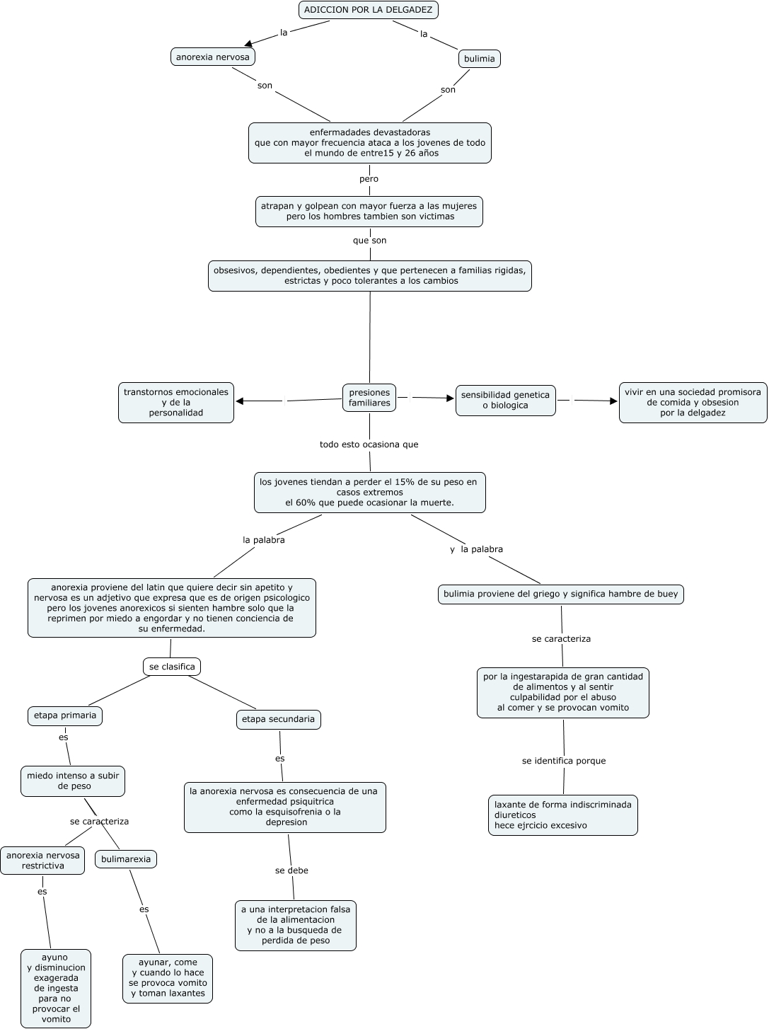 Este Cmap, tiene información relacionada con: stephanie.cmap, anorexia nervosa restrictiva es ayuno y disminucion exagerada de ingesta para no provocar el vomito, bulimarexia es ayunar, come y cuando lo hace se provoca vomito y toman laxantes, bulimia proviene del griego y significa hambre de buey se caracteriza por la ingestarapida de gran cantidad de alimentos y al sentir culpabilidad por el abuso al comer y se provocan vomito, atrapan y golpean con mayor fuerza a las mujeres pero los hombres tambien son victimas que son presiones familiares, presiones familiares todo esto ocasiona que los jovenes tiendan a perder el 15% de su peso en casos extremos el 60% que puede ocasionar la muerte., anorexia proviene del latin que quiere decir sin apetito y nervosa es un adjetivo que expresa que es de origen psicologico pero los jovenes anorexicos si sienten hambre solo que la reprimen por miedo a engordar y no tienen conciencia de su enfermedad. etapa primaria, etapa secundaria es la anorexia nervosa es consecuencia de una enfermedad psiquitrica como la esquisofrenia o la depresion, ADICCION POR LA DELGADEZ la bulimia, etapa primaria es miedo intenso a subir de peso, enfermadades devastadoras que con mayor frecuencia ataca a los jovenes de todo el mundo de entre15 y 26 años pero atrapan y golpean con mayor fuerza a las mujeres pero los hombres tambien son victimas, anorexia nervosa son enfermadades devastadoras que con mayor frecuencia ataca a los jovenes de todo el mundo de entre15 y 26 años, miedo intenso a subir de peso bulimarexia, los jovenes tiendan a perder el 15% de su peso en casos extremos el 60% que puede ocasionar la muerte. la palabra anorexia proviene del latin que quiere decir sin apetito y nervosa es un adjetivo que expresa que es de origen psicologico pero los jovenes anorexicos si sienten hambre solo que la reprimen por miedo a engordar y no tienen conciencia de su enfermedad., ADICCION POR LA DELGADEZ la anorexia nervosa, los jovenes tiendan a perder el 15% de su peso en casos extremos el 60% que puede ocasionar la muerte. y la palabra bulimia proviene del griego y significa hambre de buey, etapa secundaria etapa primaria, la anorexia nervosa es consecuencia de una enfermedad psiquitrica como la esquisofrenia o la depresion se debe a una interpretacion falsa de la alimentacion y no a la busqueda de perdida de peso, presiones familiares sensibilidad genetica o biologica, anorexia proviene del latin que quiere decir sin apetito y nervosa es un adjetivo que expresa que es de origen psicologico pero los jovenes anorexicos si sienten hambre solo que la reprimen por miedo a engordar y no tienen conciencia de su enfermedad. se clasifica, por la ingestarapida de gran cantidad de alimentos y al sentir culpabilidad por el abuso al comer y se provocan vomito se identifica porque laxante de forma indiscriminada diureticos hece ejrcicio excesivo