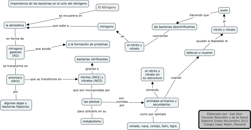 Este Cmap, tiene información relacionada con: El ciclo del nitrógeno.cmap, nitrogeno gaseoso (N2) se transforma en amoniaco (NH3), animales primarios y secundarios teniendo el nitrito y nitrato en su estructura, animales primarios y secundarios como por ejemplo venado, vaca, conejo, león, tigre., la atmósfera en forma de nitrogeno gaseoso (N2), las plantas son comidas por animales primarios y secundarios, el nitrito y nitrato en nitrógeno, nitrógeno que sube a la atmósfera, animales primarios y secundarios cuando defecan o mueren, nitritos (NO2) y nitratos (NO3) que son incorporadas por las plantas, nitrito y nitrato al suelo, las bacterias desnitrificantes conviertan el nitrito y nitrato, amoniaco (NH3) que se transforma en nitritos (NO2) y nitratos (NO3), nitritos (NO2) y nitratos (NO3) gracias a bacterias nitrificantes, El Nitrógeno se encuentra en la atmósfera, suelo haciendo que las bacterias desnitrificantes, defecan o mueren ayudan a depositar el nitrito y nitrato, las plantas para utilizarlo en su metabolismo, amoniaco (NH3) por algunas algas y bacterias fijadoras., nitrogeno gaseoso (N2) que ayuda a la formación de proteínas