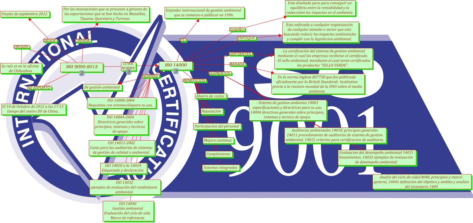 Este Cmap, tiene información relacionada con: ISO 14000, ISO 14000 BENEFICIOS Mejora continua, ISO 14000 ES Estandar internacional de gestión ambiental que se comenzo a públicar en 1996., ISO 14000 NORMAS ISO 14000-2004 Requisitos con orientaciónpara su uso., ISO 14000 BASADA En la norma inglesa BS7750 que fue públicada oficialmente por la British Standards Institution previa a la reunion mundial de la ONU sobre el medio ambiente., ISO 14000 BENEFICIOS Ahorro de costos, ISO 14000 NORMAS ISO 14020 a la 14024 Etiquetado y declaración, ISO 14000 ELEMENTOS Evaluacion del desempeño ambiental 14031 lineamientos, 14032 ejemplos de evaluación de desempeño ambiental., ISO 14000 NORMAS ISO 14011-2002 Guias para las auditorias de sistemas de gestión de calidad o ambiental., ISO 14000 VERTIENTES - La certificación del sistema de gestion ambiental mediante el cual las empresas recibiran el certificado. - El sello ambiental, mendiante el cual seran certificados los productos "SELLO VERDE"., ISO 14000 NORMAS ISO 14032 ejemplos de evaluación del rendimiento ambiental., ISO 14000 BENEFICIOS Participacion del personal, ISO 14000 BENEFICIOS Cumplimiento, ISO 9000-2013 SE EXPORTO El 14 de Octubre de 2012 a las 17:13 tiempo del centro DF de China., ISO 9000-2013 CREADA Por las innovaciones que se procesan a gtravez de las exportaciones que se han hecho en Mazatlan, Tijuana, Queretaro y Torreon., ISO 14000 NORMAS ISO 14040 Gestión ambiental Evaluación del ciclo de vida Marco de referencia., ISO 9000-2013 DESDE Finales de septiembre 2012, ISO 14000 ELEMENTOS Auditorias ambientales 14010, principios generales 14011 procedimiento de auditorias de sistema de gestion ambiental, 14012 criterios para certificacion de auditores., ISO 14000 DISEÑO Esta diseñada para para conseguir un equilibrio entre la rentabilidad y la reducciónn los impactos en el ambiente., ISO 14000 ELEMENTOS - Sistema de gestion ambienta 14001 especificaciones y directrices para su uso, 14004 directivas generales sobre principios, sistemas y tecnica de apoyo., ISO 9000-2013 OTRA NORMA ISO 14000