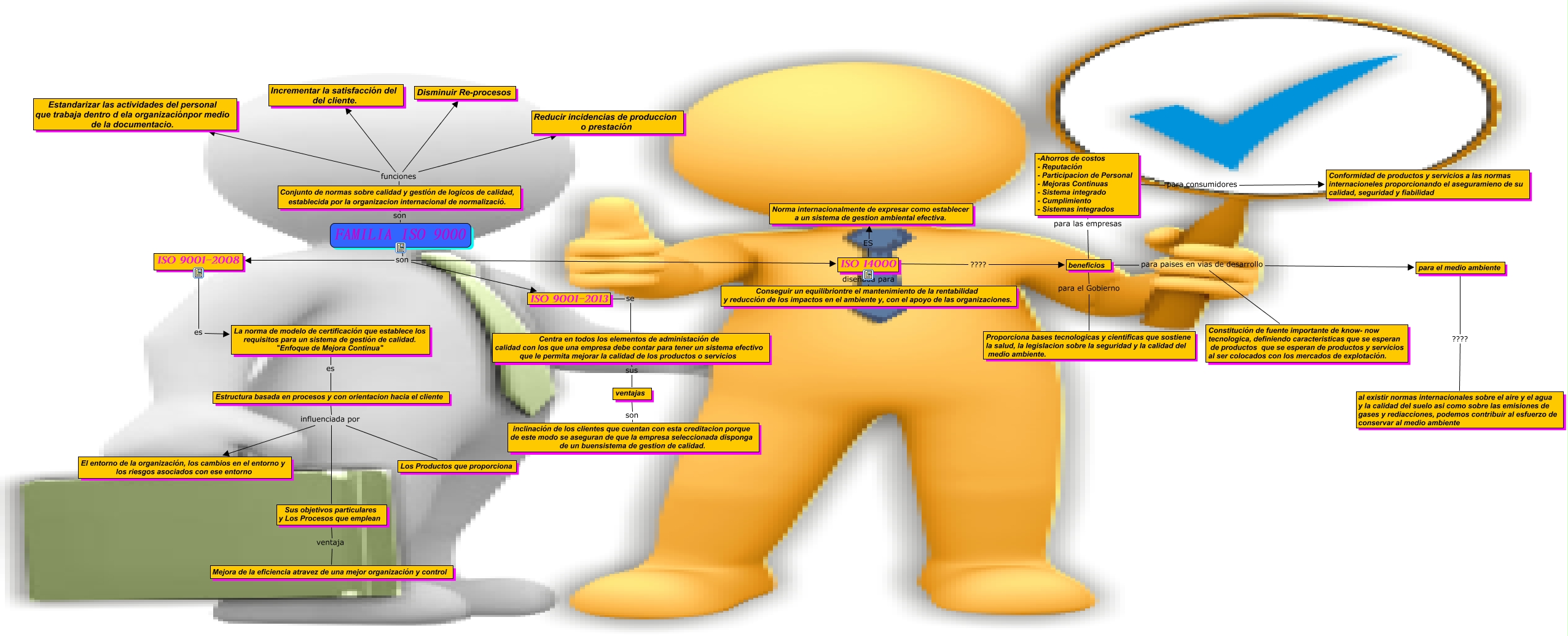 Este Cmap, tiene información relacionada con: Familia ISO 9000, ISO 14000 ???? beneficios, ISO 9001-2008 es La norma de modelo de certificación que establece los requisitos para un sistema de gestión de calidad. "Enfoque de Mejora Continua", ISO 14000 ES Norma internacionalmente de expresar como establecer a un sistema de gestion ambiental efectiva., Centra en todos los elementos de administación de calidad con los que una empresa debe contar para tener un sistema efectivo que le permita mejorar la calidad de los productos o servicios sus ventajas, FAMILIA ISO 9000 son ISO 14000, -Ahorros de costos - Reputación - Participacion de Personal - Mejoras Continuas - Sistema integrado - Cumplimiento - Sistemas integrados para consumidores Conformidad de productos y servicios a las normas internacioneles proporcionando el aseguramieno de su calidad, seguridad y fiabilidad, Conjunto de normas sobre calidad y gestión de logicos de calidad, establecida por la organizacion internacional de normalizació. funciones Reducir incidencias de produccion o prestación, beneficios para el Gobierno Proporciona bases tecnologicas y cientificas que sostiene la salud, la legislacion sobre la seguridad y la calidad del medio ambiente., beneficios para paises en vias de desarrollo Constitución de fuente importante de know- now tecnologica, definiendo caracteristicas que se esperan de productos que se esperan de productos y servicios al ser colocados con los mercados de explotación., Estructura basada en procesos y con orientacion hacia el cliente influenciada por El entorno de la organización, los cambios en el entorno y los riesgos asociados con ese entorno, Conjunto de normas sobre calidad y gestión de logicos de calidad, establecida por la organizacion internacional de normalizació. funciones Incrementar la satisfacción del del cliente., ISO 14000 diseñada para Conseguir un equilibriontre el mantenimiento de la rentabilidad y reducción de los impactos en el ambiente y, con el apoyo de las organizaciones., para el medio ambiente ???? al existir normas internacionales sobre el aire y el agua y la calidad del suelo asi como sobre las emisiones de gases y rediacciones, podemos contribuir al esfuerzo de conservar al medio ambiente, Conjunto de normas sobre calidad y gestión de logicos de calidad, establecida por la organizacion internacional de normalizació. funciones Disminuir Re-procesos, FAMILIA ISO 9000 son ISO 9001-2013, ventajas son inclinación de los clientes que cuentan con esta creditacion porque de este modo se aseguran de que la empresa seleccionada disponga de un buensistema de gestion de calidad., beneficios para las empresas -Ahorros de costos - Reputación - Participacion de Personal - Mejoras Continuas - Sistema integrado - Cumplimiento - Sistemas integrados, Conjunto de normas sobre calidad y gestión de logicos de calidad, establecida por la organizacion internacional de normalizació. funciones Estandarizar las actividades del personal que trabaja dentro d ela organizaciónpor medio de la documentacio., FAMILIA ISO 9000 son Conjunto de normas sobre calidad y gestión de logicos de calidad, establecida por la organizacion internacional de normalizació., La norma de modelo de certificación que establece los requisitos para un sistema de gestión de calidad. "Enfoque de Mejora Continua" es Estructura basada en procesos y con orientacion hacia el cliente