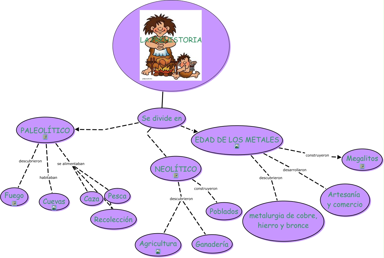 Este mapa conceptual ten información relativa a: LA PREHISTORIA, PALEOLÍTICO se alimentaban Caza, Caza ???? Recolección, Se divide en PALEOLÍTICO, EDAD DE LOS METALES desarrollaron Artesanía y comercio, PALEOLÍTICO descubrieron Fuego, Se divide en EDAD DE LOS METALES, LA PREHISTORIA ???? Se divide en, NEOLÍTICO descubrieron Agricultura, PALEOLÍTICO se alimentaban Pesca, EDAD DE LOS METALES descubrieron metalurgia de cobre, hierro y bronce, Se divide en NEOLÍTICO, Caza ???? Pesca, NEOLÍTICO descubrieron Ganadería, PALEOLÍTICO habitaban Cuevas, NEOLÍTICO construyeron Poblados, EDAD DE LOS METALES construyeron Megalitos, PALEOLÍTICO se alimentaban Recolección