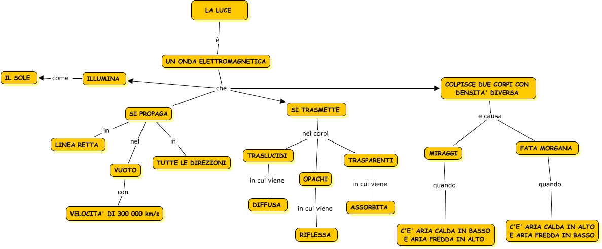 Questa Cmap, creata con IHMC CmapTools, contiene informazioni relative a: LUCE, UN ONDA ELETTROMAGNETICA che SI TRASMETTE, UN ONDA ELETTROMAGNETICA che SI PROPAGA, SI TRASMETTE nei corpi OPACHI, LA LUCE è UN ONDA ELETTROMAGNETICA, VUOTO con VELOCITA' DI 300 000 km/s, UN ONDA ELETTROMAGNETICA che COLPISCE DUE CORPI CON DENSITA' DIVERSA, TRASLUCIDI in cui viene DIFFUSA, ILLUMINA come IL SOLE, SI PROPAGA in LINEA RETTA, COLPISCE DUE CORPI CON DENSITA' DIVERSA e causa MIRAGGI, SI TRASMETTE nei corpi TRASLUCIDI, UN ONDA ELETTROMAGNETICA che ILLUMINA, COLPISCE DUE CORPI CON DENSITA' DIVERSA e causa FATA MORGANA, SI PROPAGA in TUTTE LE DIREZIONI, SI PROPAGA nel VUOTO, MIRAGGI quando C'E' ARIA CALDA IN BASSO E ARIA FREDDA IN ALTO, SI TRASMETTE nei corpi TRASPARENTI, FATA MORGANA quando C'E' ARIA CALDA IN ALTO E ARIA FREDDA IN BASSO, TRASPARENTI in cui viene ASSORBITA, OPACHI in cui viene RIFLESSA