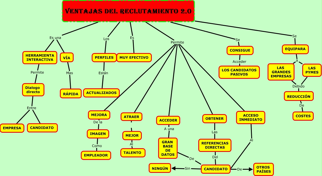 Este Cmap, tiene información relacionada con: VENTAJAS, CANDIDATO De OTROS PAÍSES, LAS GRANDES EMPRESAS Debido REDUCCIÓN, CANDIDATO Sin NINGÚN, ACCEDER A una GRAN BASE DE DATOS, VENTAJAS DEL RECLUTAMIENTO 2.0 Se CONSIGUE, Dialogo directo Entre EMPRESA, EQUIPARA a LAS PYMES, LAS PYMES Debido REDUCCIÓN, MEJOR Al TALENTO, EQUIPARA a LAS GRANDES EMPRESAS, HERRAMIENTA INTERACTIVA Permite Dialogo directo, CONSIGUE Acceder LOS CANDIDATOS PASIVOS, PERFILES Están ACTUALIZADOS, IMAGEN Como EMPLEADOR, MEJORA De la IMAGEN, VENTAJAS DEL RECLUTAMIENTO 2.0 Permite ACCEDER, VENTAJAS DEL RECLUTAMIENTO 2.0 Permite ATRAER, VENTAJAS DEL RECLUTAMIENTO 2.0 Permite OBTENER, VENTAJAS DEL RECLUTAMIENTO 2.0 Es una VÍA, REFERENCIAS DIRECTAS Del CANDIDATO