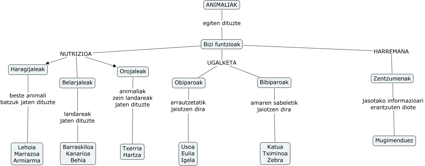 IHMC CmapTools-ekin sortu den kontzeptu-mapa honek honi buruzko informazioa du: Animaliak-Bizi funtzioak (1), Bibiparoak amaren sabeletik jaiotzen dira Katua Tximinoa Zebra, Bizi funtzioak UGALKETA Bibiparoak, ANIMALIAK egiten dituzte Bizi funtzioak, Bizi funtzioak HARREMANA Zentzumenak, Haragijaleak beste animali batzuk jaten dituzte Lehoia Marrazoa Armiarma, Bizi funtzioak NUTRIZIOA Orojaleak, Zentzumenak jasotako informazioari erantzuten diote Mugimenduez, Bizi funtzioak UGALKETA Obiparoak, Obiparoak arrautzetatik jaiotzen dira Usoa Eulia Igela, Bizi funtzioak NUTRIZIOA Haragijaleak, Orojaleak animaliak zein landareak jaten dituzte Txerria Hartza, Bizi funtzioak NUTRIZIOA Belarjaleak, Belarjaleak landareak jaten dituzte Barraskiloa Kanarioa Behia