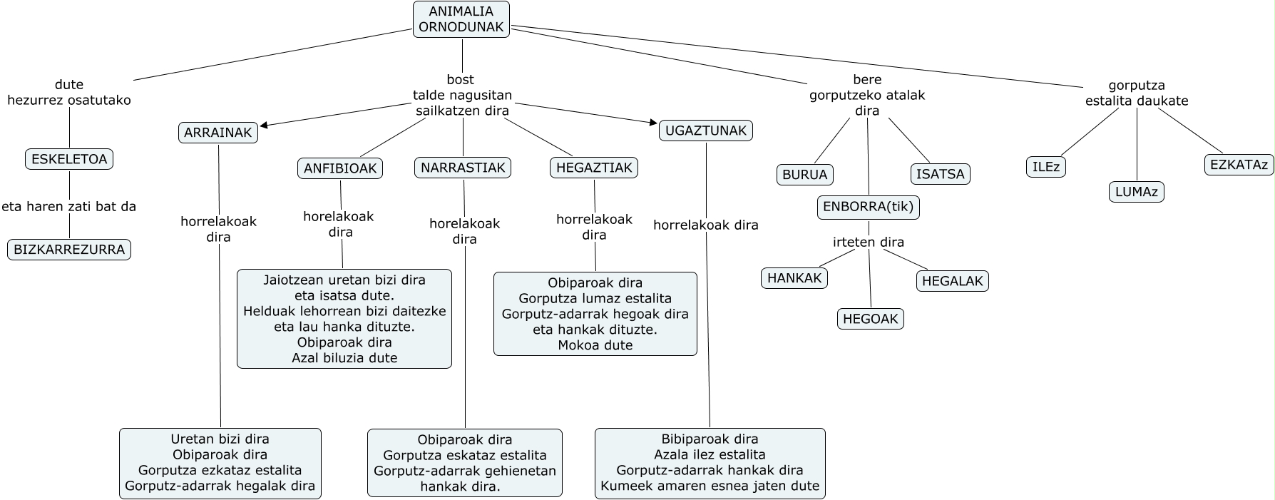 IHMC CmapTools-ekin sortu den kontzeptu-mapa honek honi buruzko informazioa du: Animaliak-Ornodunak (2), ANIMALIA ORNODUNAK bost talde nagusitan sailkatzen dira ARRAINAK, ANIMALIA ORNODUNAK bere gorputzeko atalak dira BURUA, ANIMALIA ORNODUNAK bere gorputzeko atalak dira ENBORRA(tik), ANIMALIA ORNODUNAK bost talde nagusitan sailkatzen dira UGAZTUNAK, ANIMALIA ORNODUNAK gorputza estalita daukate LUMAz, ANIMALIA ORNODUNAK dute hezurrez osatutako ESKELETOA, ENBORRA(tik) irteten dira HEGOAK, ANIMALIA ORNODUNAK gorputza estalita daukate EZKATAz, ARRAINAK horrelakoak dira Uretan bizi dira Obiparoak dira Gorputza ezkataz estalita Gorputz-adarrak hegalak dira, ANIMALIA ORNODUNAK bost talde nagusitan sailkatzen dira NARRASTIAK, HEGAZTIAK horrelakoak dira Obiparoak dira Gorputza lumaz estalita Gorputz-adarrak hegoak dira eta hankak dituzte. Mokoa dute, ANIMALIA ORNODUNAK gorputza estalita daukate ILEz, ANIMALIA ORNODUNAK bost talde nagusitan sailkatzen dira ANFIBIOAK, NARRASTIAK horelakoak dira Obiparoak dira Gorputza eskataz estalita Gorputz-adarrak gehienetan hankak dira., ANFIBIOAK horelakoak dira Jaiotzean uretan bizi dira eta isatsa dute. Helduak lehorrean bizi daitezke eta lau hanka dituzte. Obiparoak dira Azal biluzia dute, ENBORRA(tik) irteten dira HANKAK, ENBORRA(tik) irteten dira HEGALAK, ANIMALIA ORNODUNAK bost talde nagusitan sailkatzen dira HEGAZTIAK, ANIMALIA ORNODUNAK bere gorputzeko atalak dira ISATSA, UGAZTUNAK horrelakoak dira Bibiparoak dira Azala ilez estalita Gorputz-adarrak hankak dira Kumeek amaren esnea jaten dute