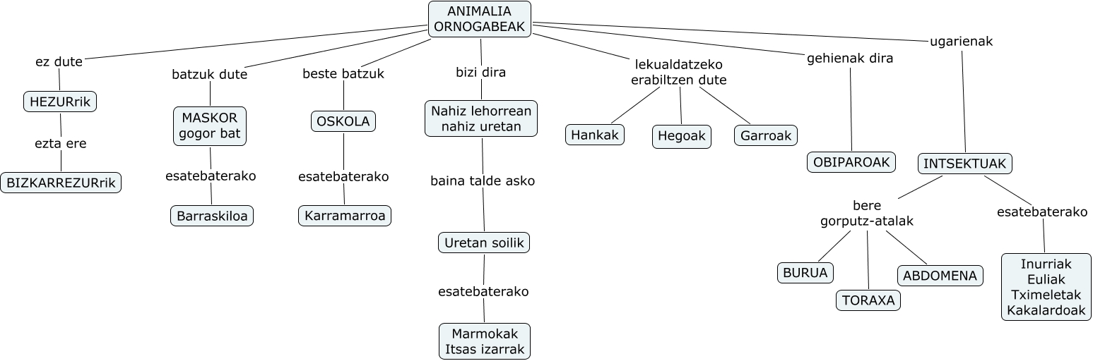 IHMC CmapTools-ekin sortu den kontzeptu-mapa honek honi buruzko informazioa du: Animaliak-Ornogabeak (3), MASKOR gogor bat esatebaterako Barraskiloa, INTSEKTUAK bere gorputz-atalak BURUA, ANIMALIA ORNOGABEAK bizi dira Nahiz lehorrean nahiz uretan, ANIMALIA ORNOGABEAK ugarienak INTSEKTUAK, ANIMALIA ORNOGABEAK lekualdatzeko erabiltzen dute Hegoak, ANIMALIA ORNOGABEAK lekualdatzeko erabiltzen dute Garroak, ANIMALIA ORNOGABEAK batzuk dute MASKOR gogor bat, Nahiz lehorrean nahiz uretan baina talde asko Uretan soilik, INTSEKTUAK bere gorputz-atalak TORAXA, OSKOLA esatebaterako Karramarroa, INTSEKTUAK esatebaterako Inurriak Euliak Tximeletak Kakalardoak, ANIMALIA ORNOGABEAK ez dute HEZURrik, INTSEKTUAK bere gorputz-atalak ABDOMENA, ANIMALIA ORNOGABEAK gehienak dira OBIPAROAK, Uretan soilik esatebaterako Marmokak Itsas izarrak, ANIMALIA ORNOGABEAK beste batzuk OSKOLA, ANIMALIA ORNOGABEAK lekualdatzeko erabiltzen dute Hankak, HEZURrik ezta ere BIZKARREZURrik