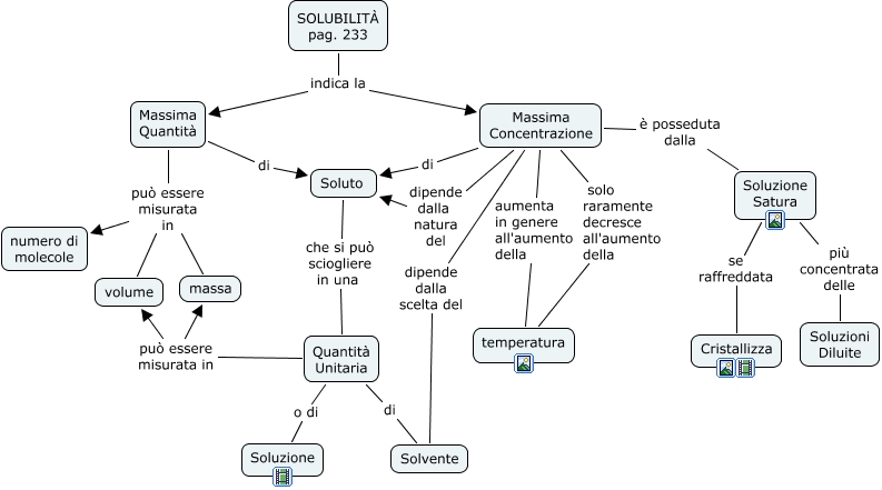 Questa Cmap, creata con IHMC CmapTools, contiene informazioni relative a: Soluzioni, Massima Concentrazione è posseduta dalla Soluzione Satura, Soluzione Satura se raffreddata Cristallizza, Quantità Unitaria o di Soluzione, Massima Concentrazione dipende dalla natura del Soluto, Massima Concentrazione aumenta in genere all'aumento della temperatura, Massima Concentrazione dipende dalla scelta del Solvente, Quantità Unitaria può essere misurata in massa, Massima Concentrazione solo raramente decresce all'aumento della temperatura, Soluzione Satura più concentrata delle Soluzioni Diluite, SOLUBILITÀ pag. 233 indica la Massima Quantità, Massima Quantità di Soluto, Quantità Unitaria di Solvente, Quantità Unitaria può essere misurata in volume, Massima Concentrazione di Soluto, Massima Quantità può essere misurata in numero di molecole, Massima Quantità può essere misurata in volume, Massima Quantità può essere misurata in massa, SOLUBILITÀ pag. 233 indica la Massima Concentrazione, Soluto che si può sciogliere in una Quantità Unitaria