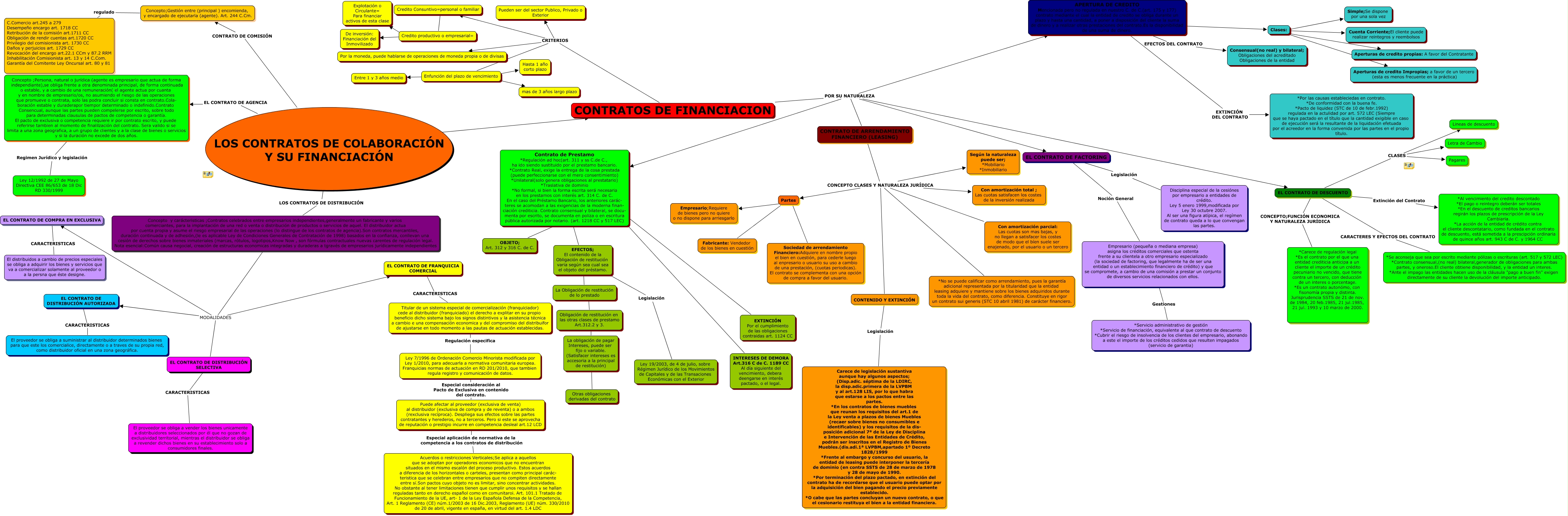 This Concept Map, created with IHMC CmapTools, has information related to: los contratos de colaboración y financiación, Credito productivo o empresarial= ???? De inversión: Financiación del Inmovilizado, Concepto y carácteristicas ;Contratos celebrados entre empresarios independientes,generalmente un fabricante y varios comerciantes, para la implantación de una red o venta o distribución de productos o servicios de aquel. El distribuidor actua por cuenta propia y asume el riesgo empresarial de las operaciones (lo distingue de los contratos de agencia).Son contratos mercantiles, duración continuada y de adhesión,(le es aplicable Ley de Condiciones Generales de Contratación de 1998) basados en la confianza, conllevan una cesión de derechos sobre bienes inmateriales (marcas, rótulos, logotipos,Know Now , son fórmulas contractuales nuevas carentes de regulación legal. Nota esencial:Común causa negocial, creación de estructuras economicas integradas y duraderas a tgravés de empresarios jurídicamente independientes MODALIDADES EL CONTRATO DE FRANQUICIA COMERCIAL, Enfunción del plazo de vencimiento ???? mas de 3 años largo plazo, Clases: ???? Aperturas de credito Impropias; a favor de un tercero (esta es menos frecuente en la práctica), LOS CONTRATOS DE COLABORACIÓN Y SU FINANCIACIÓN LOS CONTRATOS DE DISTRIBUCIÓN Concepto y carácteristicas ;Contratos celebrados entre empresarios independientes,generalmente un fabricante y varios comerciantes, para la implantación de una red o venta o distribución de productos o servicios de aquel. El distribuidor actua por cuenta propia y asume el riesgo empresarial de las operaciones (lo distingue de los contratos de agencia).Son contratos mercantiles, duración continuada y de adhesión,(le es aplicable Ley de Condiciones Generales de Contratación de 1998) basados en la confianza, conllevan una cesión de derechos sobre bienes inmateriales (marcas, rótulos, logotipos,Know Now , son fórmulas contractuales nuevas carentes de regulación legal. Nota esencial:Común causa negocial, creación de estructuras economicas integradas y duraderas a tgravés de empresarios jurídicamente independientes, LOS CONTRATOS DE COLABORACIÓN Y SU FINANCIACIÓN EL CONTRATO DE AGENCIA Concepto ;Persona, natural o jurídica (agente es empresario que actua de forma independiante),se obliga frente a otra denominada principal, de forma continuada o estable, y a cambio de una remuneración( el agente actua por cuanta y en nombre de empresario/os, no asumiendo el riesgo de las operaciones que promueve o contrata, solo las podra concluir si consta en contrato.Cola- boración estable y duraderapor tiempor determinado o indefinido.Contrato Consencual, aunque las partes pueden compelerse por escrito, sobre todo para determinadas clausulas de pactos de competencia o garantía. El pacto de exclusiva o competencia requiere ir por contrato escrito, y puede referirse tambien al momento de finalilzación del contrato. Sera valido si se limita a una zona geografica, a un grupo de clientes y a la clase de bienes o servicios y si la duración no excede de dos años., Partes ???? Empresario;Requiere de bienes pero no quiere o no dispone para arriesgarlo, CONTENIDO Y EXTINCIÓN Legislación Carece de legislación sustantiva aunque hay algunos aspectos; (Disp.adic. séptima de la LDIRC, la disp.adic.primera de la LVPBM y al art.128 LIS, por lo que habra que estarse a los pactos entre las partes. *En los contratos de bienes muebles que reunan los requisitos del art.1 de la Ley venta a plazos de bienes Muebles (recaer sobre bienes no consumibles e identificables) y los requisitos de la dis- posición adicional 7ª de la Ley de Disciplina e Intervención de las Entidades de Crédito, podrán ser inscritos en el Registro de Bienes Muebles.(dis.adi.1ª LVPBM,apartado 1º Decreto 1828/1999 *Frente al embargo y concurso del usuario, la entidad de leasing puede interponer la tercería de dominio (en contra SSTS de 28 de marzo de 1978 y 28 de mayo de 1990. *Por terminación del plazo pactado, en extinción del contrato ha de recordarse que el usuario puede optar por la adquisición del bien pagando el precio previamente establecido. *O cabe que las partes concluyan un nuevo contrato, o que el cesionario restituya el bien a la entidad financiera., Partes ???? Fabricante: Vendedor de los bienes en cuestión, CONTRATOS DE FINANCIACION CRITERIOS Enfunción del plazo de vencimiento, Concepto y carácteristicas ;Contratos celebrados entre empresarios independientes,generalmente un fabricante y varios comerciantes, para la implantación de una red o venta o distribución de productos o servicios de aquel. El distribuidor actua por cuenta propia y asume el riesgo empresarial de las operaciones (lo distingue de los contratos de agencia).Son contratos mercantiles, duración continuada y de adhesión,(le es aplicable Ley de Condiciones Generales de Contratación de 1998) basados en la confianza, conllevan una cesión de derechos sobre bienes inmateriales (marcas, rótulos, logotipos,Know Now , son fórmulas contractuales nuevas carentes de regulación legal. Nota esencial:Común causa negocial, creación de estructuras economicas integradas y duraderas a tgravés de empresarios jurídicamente independientes MODALIDADES EL CONTRATO DE DISTRIBUCIÓN AUTORIZADA, CONTRATOS DE FINANCIACION POR SU NATURALEZA EL CONTRATO DE DESCUENTO, APERTURA DE CREDITO Mencionada pero no regulada en nuestro C. de C.(art. 175 y 177) contrato mediante el cual la entidad de credito se obliga durante un plazo y hasta una cantidad, a poner a disposición del cliente la suma de dinero y a realizar otras prestaciones del contrato.Es la disponibilidad de una suma de dinero. EXTINCIÓN DEL CONTRATO *Por las causas estableciedas en contrato. *De conformidad con la buena fe. *Pacto de liquidez (STC de 10 de febr.1992) regulada en la actulidad por art. 572 LEC (Siempre que se haya pactado en el título que la cantidad exigib