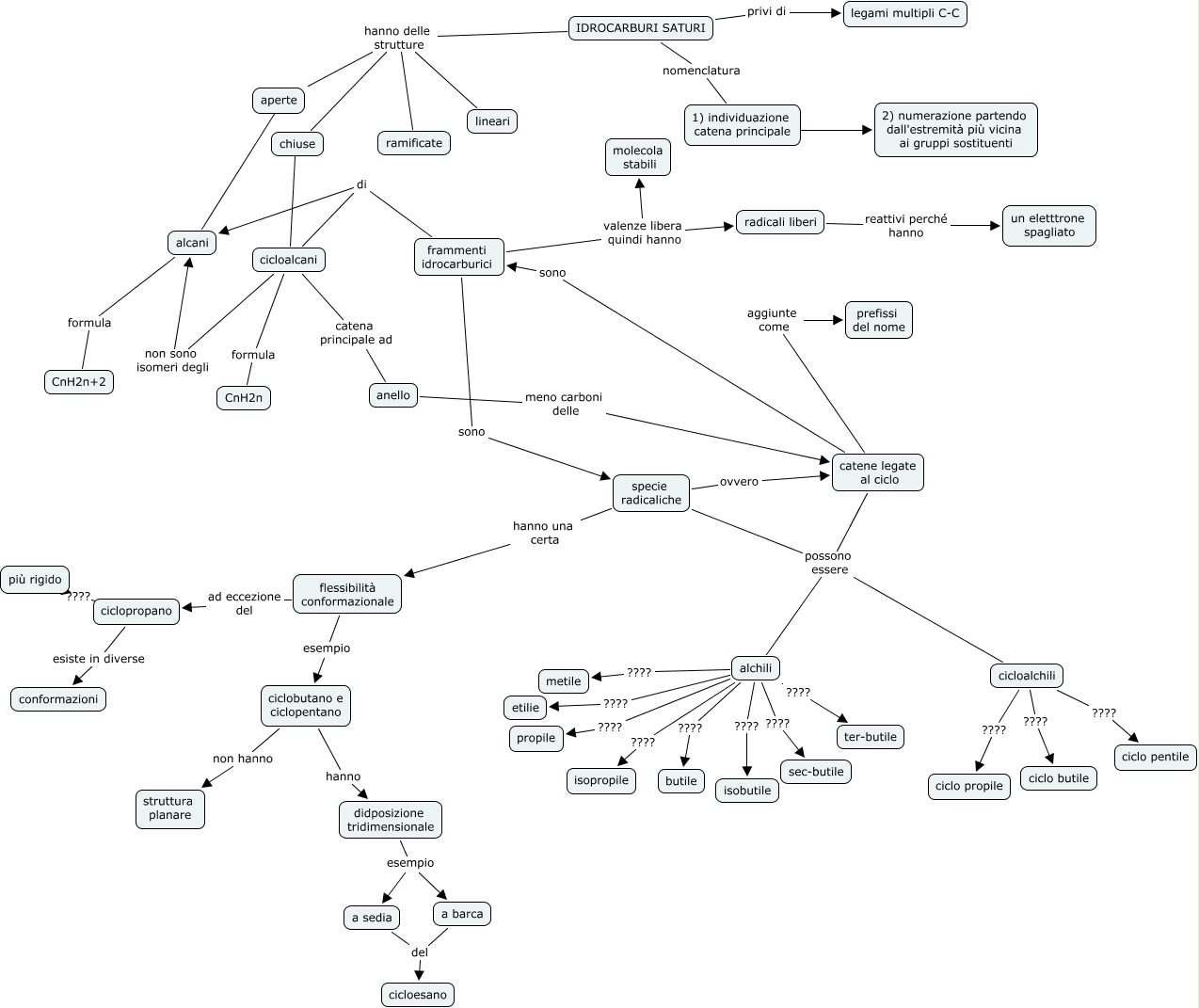 Questa Cmap, creata con IHMC CmapTools, contiene informazioni relative a: Alcani & cicloalcani, cicloalcani formula CnH2n, alchili ???? sec-butile, alchili ???? etilie, frammenti idrocarburici sono specie radicaliche, ciclopropano ???? più rigido, catene legate al ciclo possono essere cicloalchili, IDROCARBURI SATURI hanno delle strutture lineari, frammenti idrocarburici valenze libera quindi hanno radicali liberi, didposizione tridimensionale esempio a sedia, catene legate al ciclo possono essere alchili, alchili ???? propile, cicloalcani catena principale ad anello, 1) individuazione catena principale ???? 2) numerazione partendo dall'estremità più vicina ai gruppi sostituenti, ciclopropano esiste in diverse conformazioni, alchili ???? ter-butile, specie radicaliche possono essere alchili, cicloalcani non sono isomeri degli alcani, ciclobutano e ciclopentano non hanno struttura planare, radicali liberi reattivi perché hanno un eletttrone spagliato, alchili ???? butile
