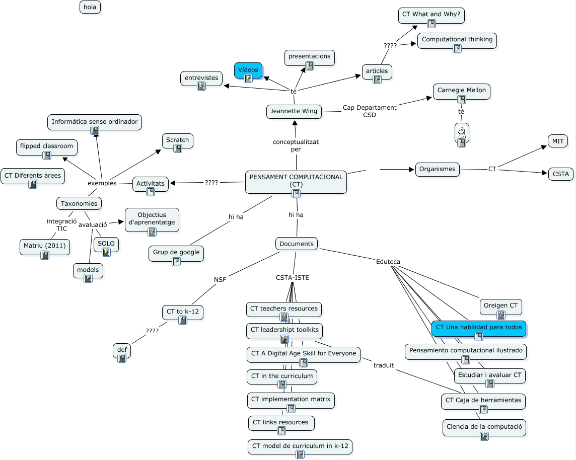 Aquest mapa conceptual conté informació relacionada amb: Computational thinking, CT leadershipt toolkits traduit CT Caja de herramientas, PENSAMENT COMPUTACIONAL (CT) hi ha Documents, PENSAMENT COMPUTACIONAL (CT) conceptualitzat per Jeannette Wing, Jeannette Wing té Vídeos, Activitats exemples flipped classroom, Documents CSTA-ISTE CT implementation matrix, Documents Eduteca CT Caja de herramientas, PENSAMENT COMPUTACIONAL (CT) Organismes, Taxonomies integració TIC Matriu (2011), Jeannette Wing té presentacions, Documents Eduteca Estudiar i avaluar CT, Documents Eduteca Ciencia de la computació, Documents Eduteca Oreigen CT, Jeannette Wing té articles, Taxonomies avaluació SOLO, Taxonomies avaluació models, Activitats exemples Taxonomies, PENSAMENT COMPUTACIONAL (CT) ???? Activitats, Activitats exemples Informàtica sense ordinador, Taxonomies avaluació Objectius d'aprenentatge